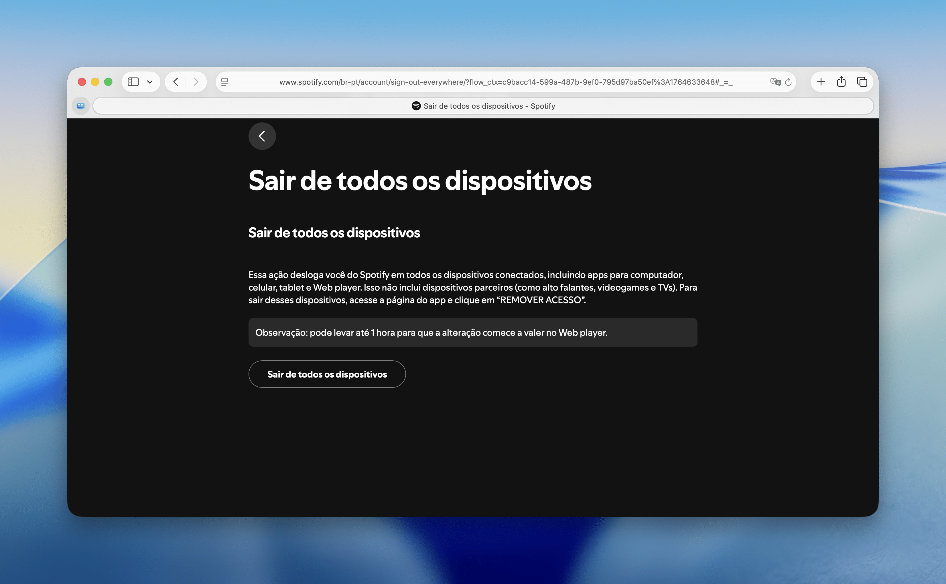 - Na página da sua conta, saia de todos os dispositivos usados com o Spotify anteriormente.