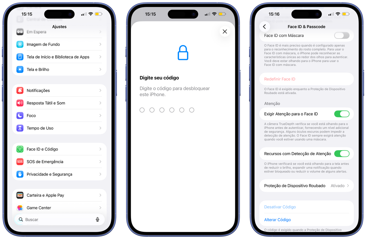 Ainda nos Ajustes, selecione “Face ID e Código” e digite o código usado para desbloquear o iPhone. Por fim, desabilite “Exigir Atenção para o Face ID”.