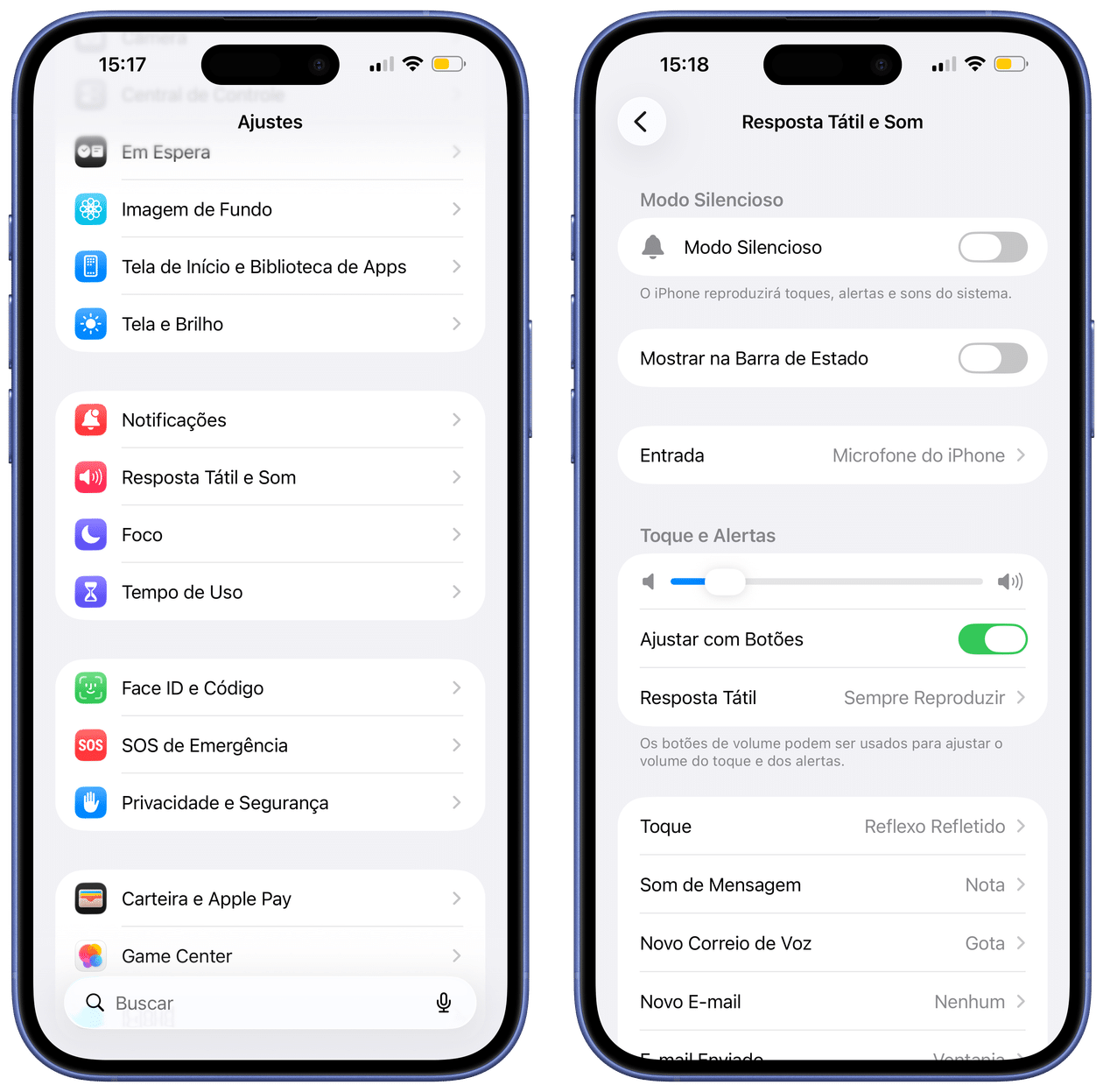 Abra os Ajustes (Settings), toque em “Resposta Tátil e Som” e use o controle deslizante abaixo de “Toque e Alertas” para o nível que você preferir.