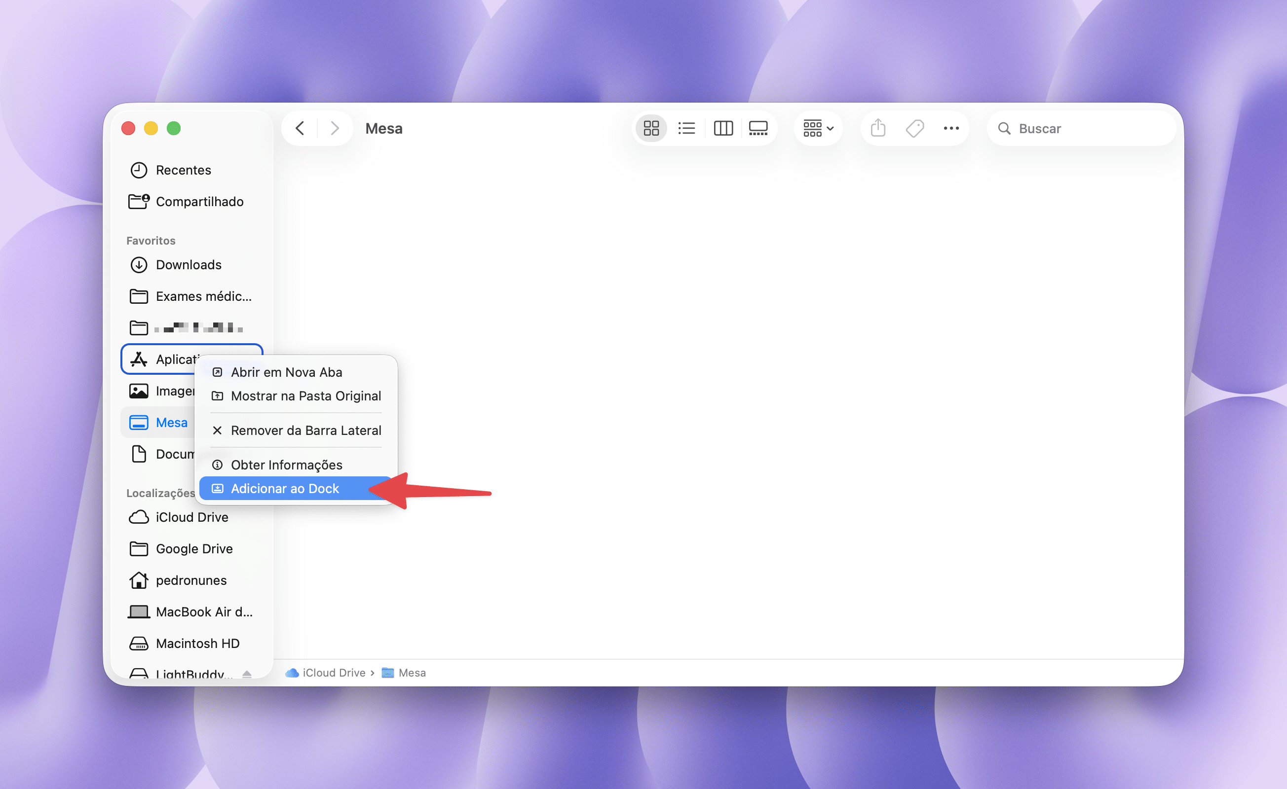- Em seguida, clique com o botão direito do mouse em cima de “Aplicativos”, na barra lateral, para selecionar “Adicionar ao Dock”. Se preferir, você também pode simplesmente arrastar “Aplicativos” para o lado da pasta Downloads e do Lixo, no canto inferior direito do Dock.