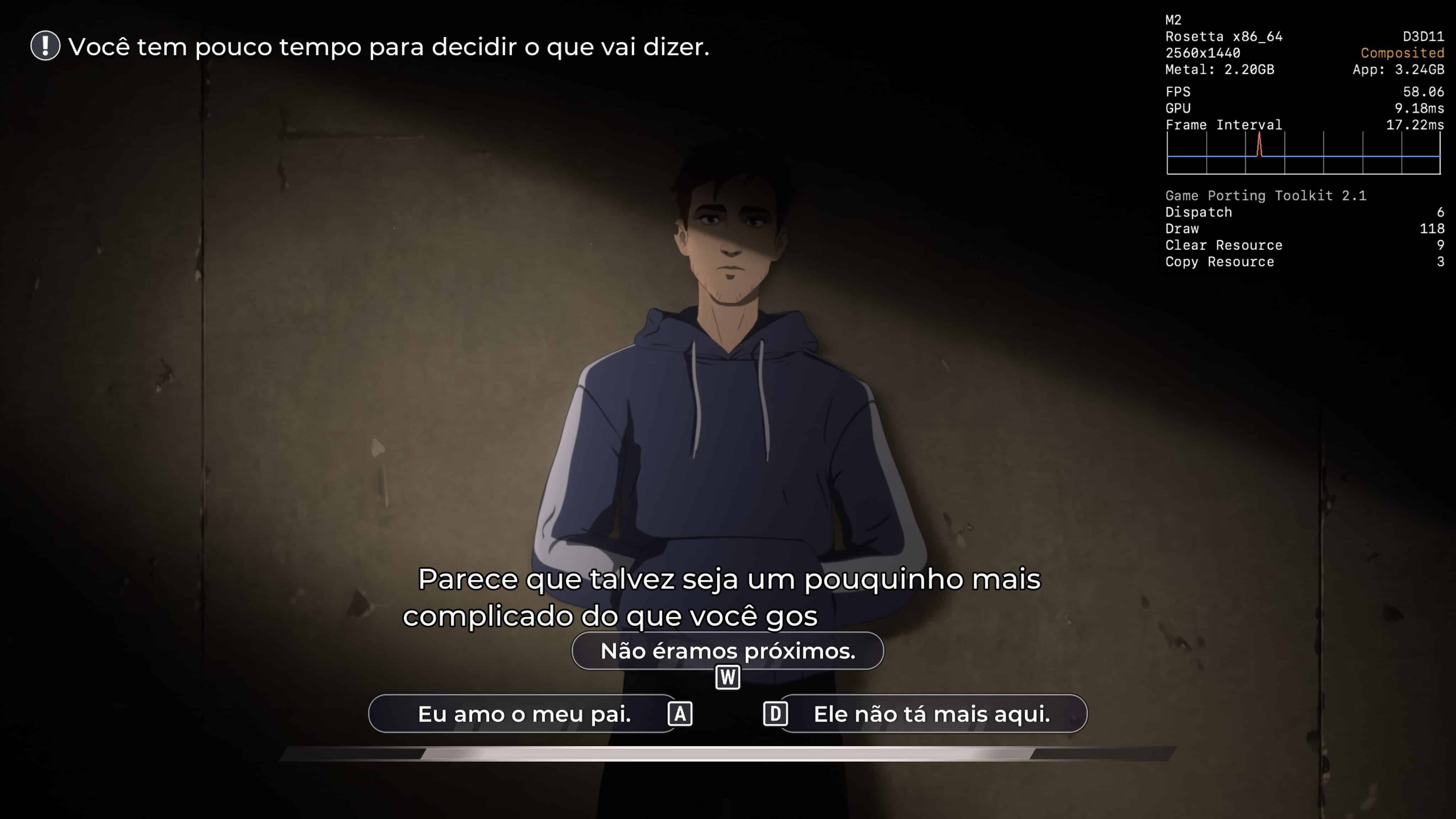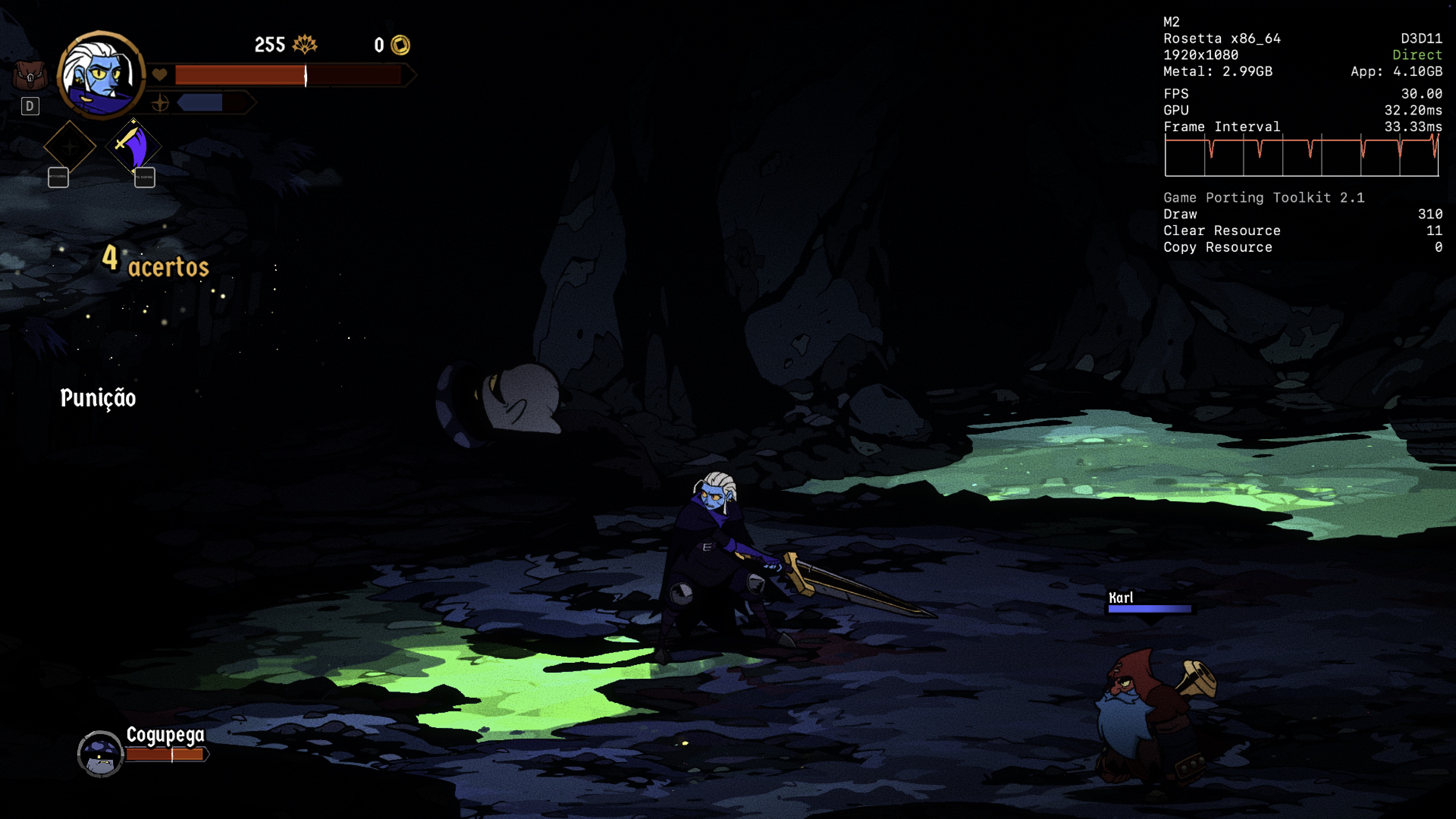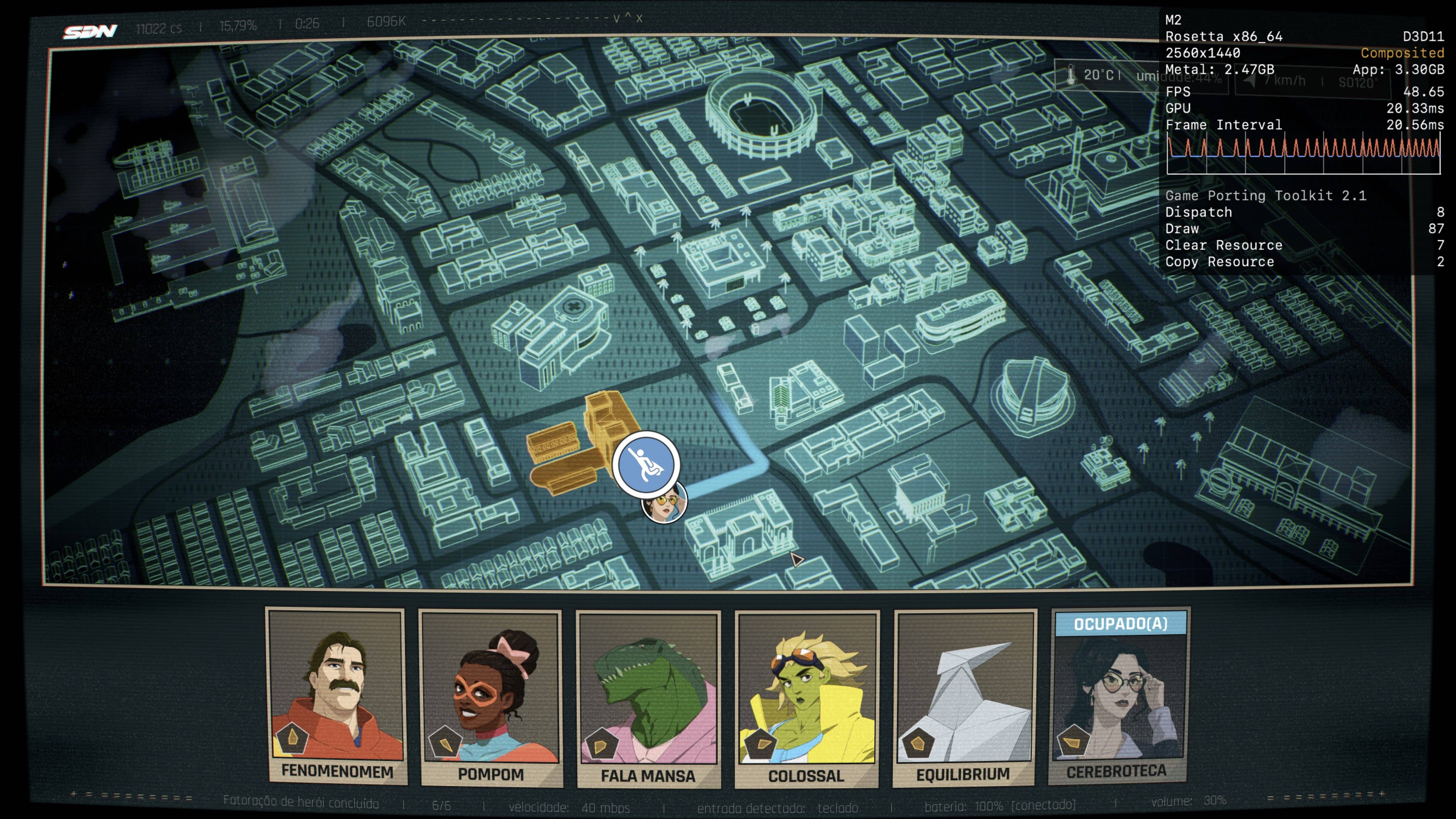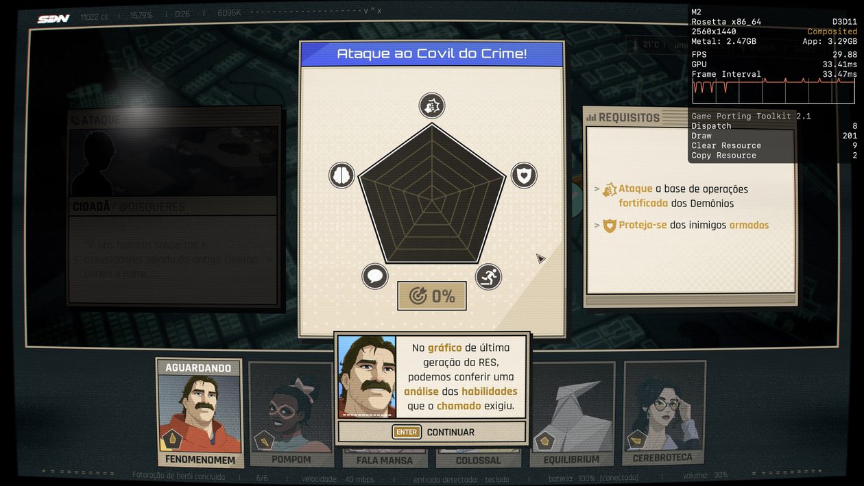 Se você tiver um Mac mais poderoso à disposição, provavelmente não terá problemas para alcançar os 60qps. No entanto, desconfio que, no meu caso, são os 8GB de memória que estão me custando alguns quadros durante a jogatina, e não o poder de fogo da CPU/GPU do chip M2.