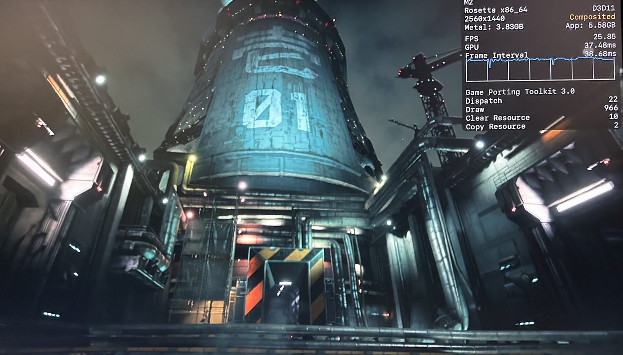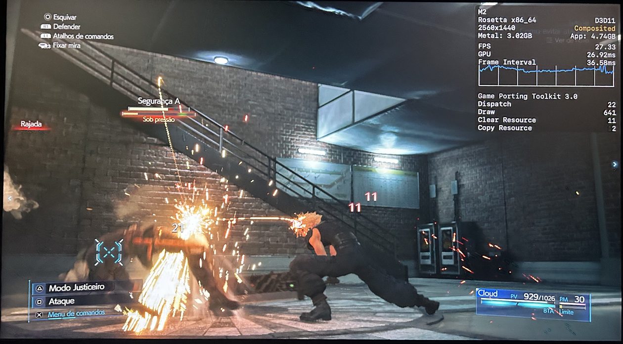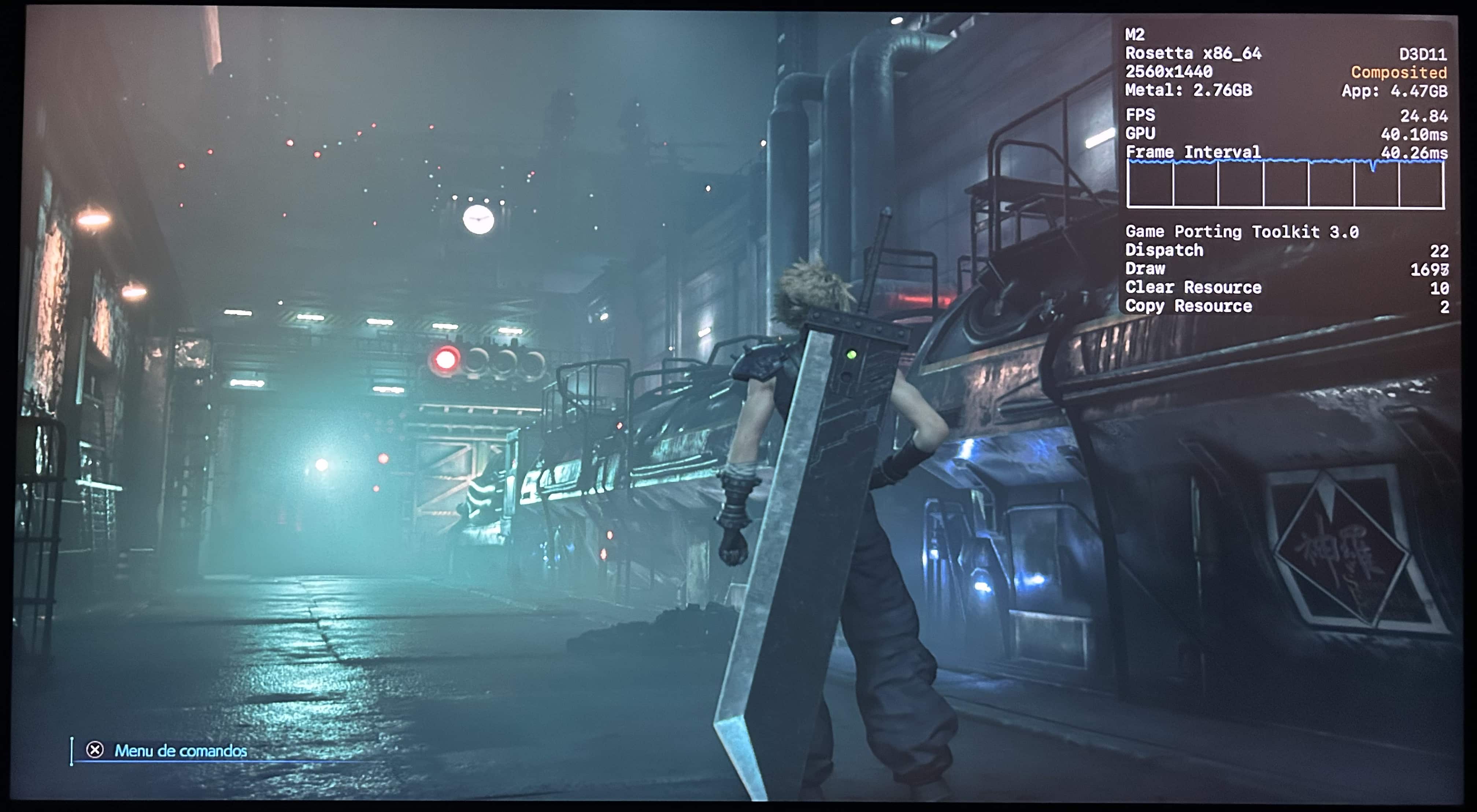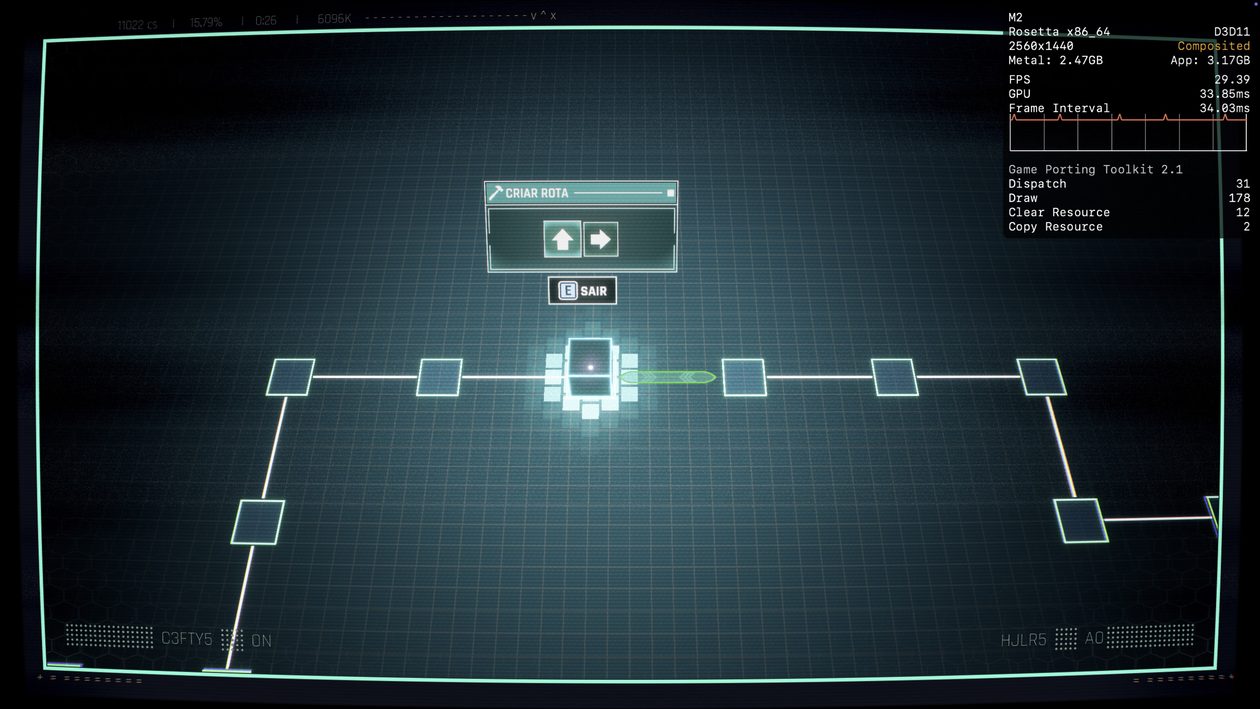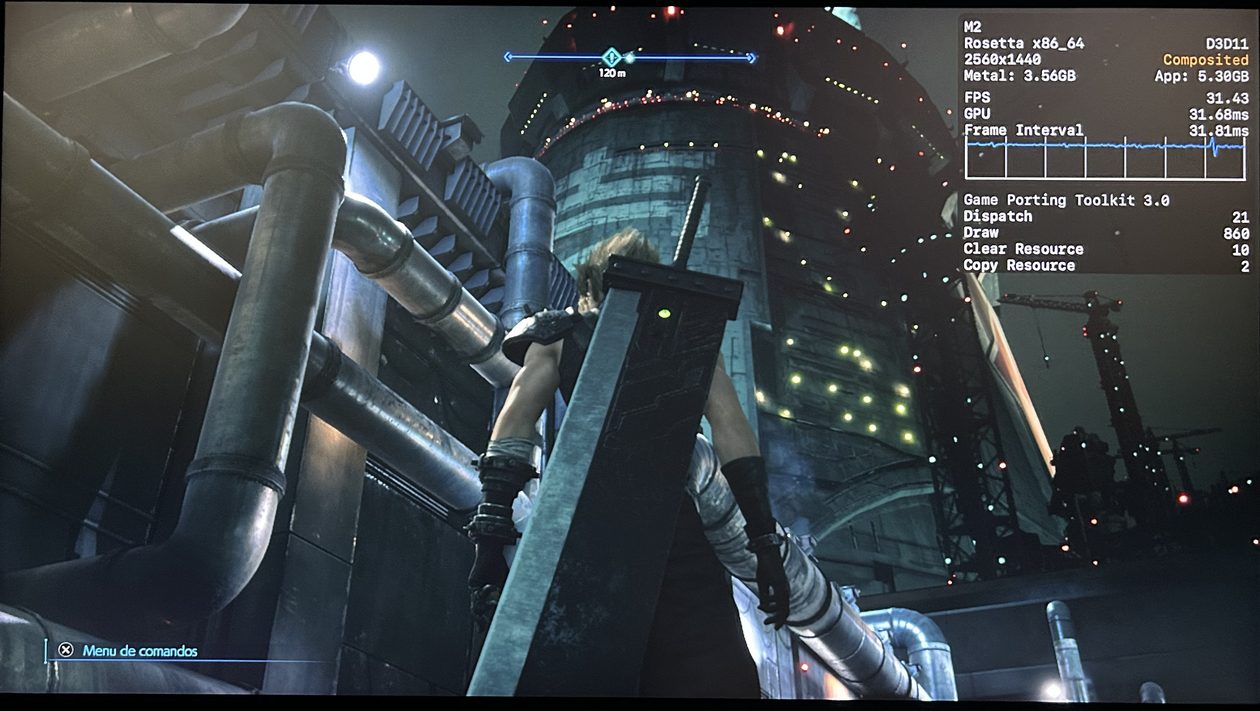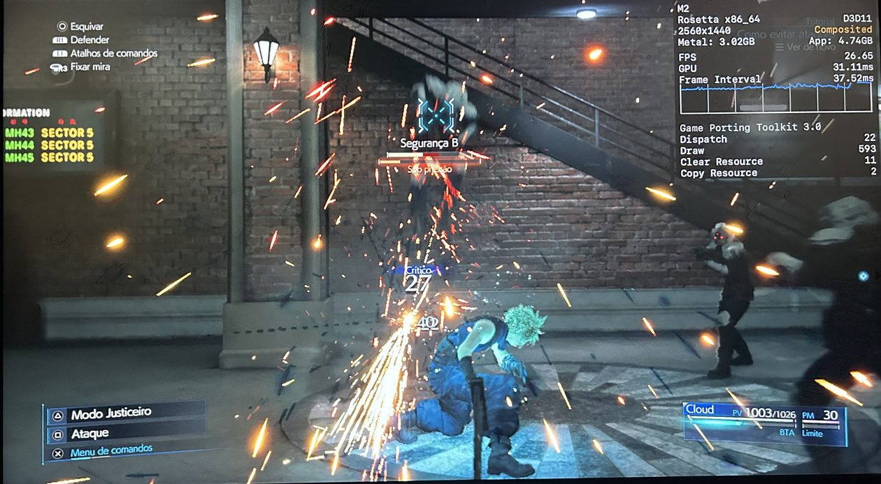 No meu Mac, o jogo rodou praticamente o tempo todo na casa dos 25-30qps, o que está longe de ser o ideal, mas ainda considero jogável pois o frame pacing não é ruim. Para tal, tive que reduzir as configurações gráficas ao máximo e colocar o jogo para rodar em 720p 2, além de selecionar o modo gráfico D3DMetal e o modo de sincronização MSync.