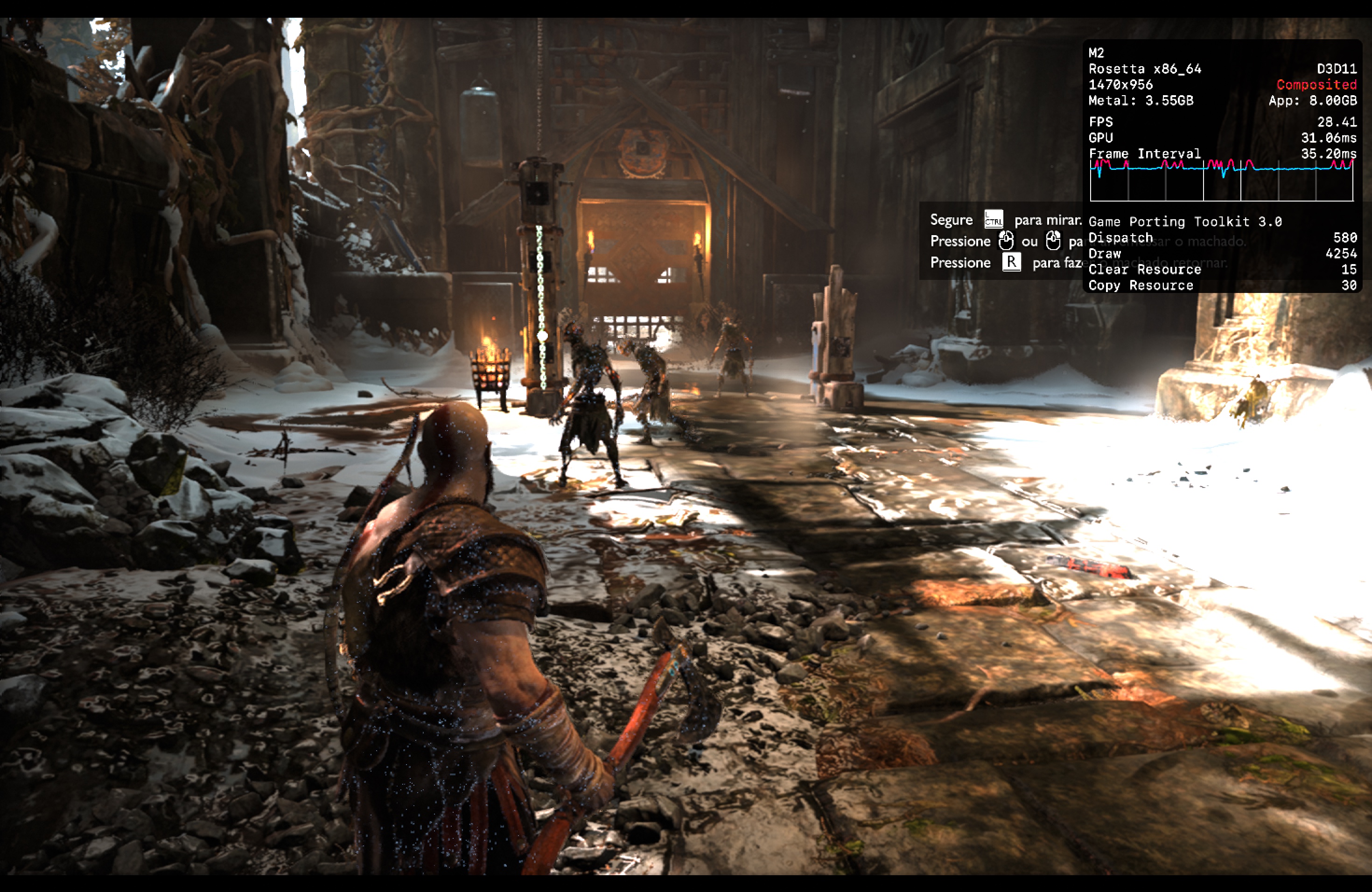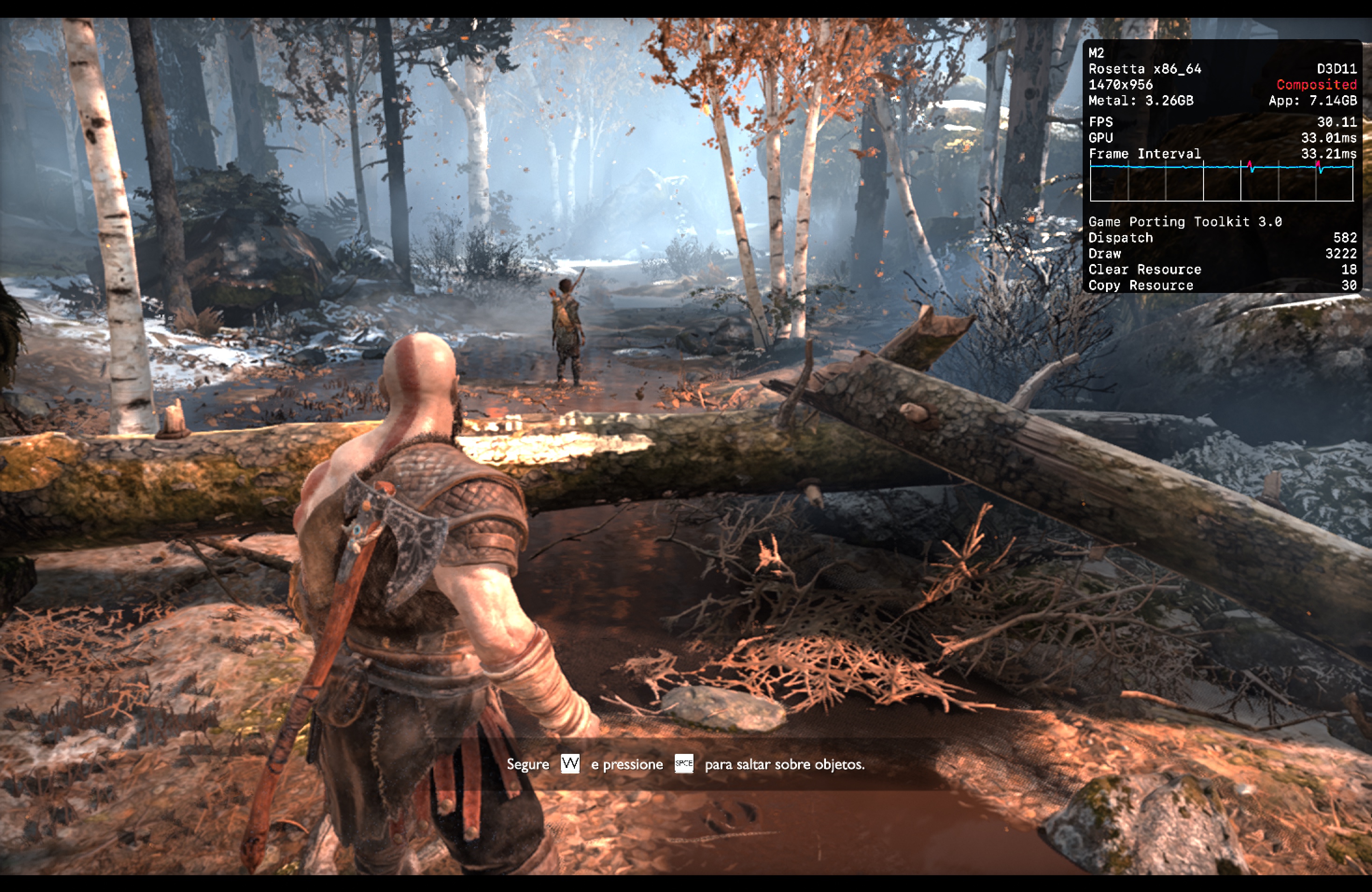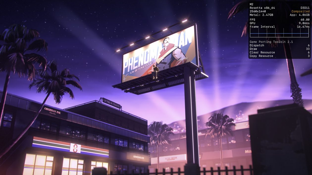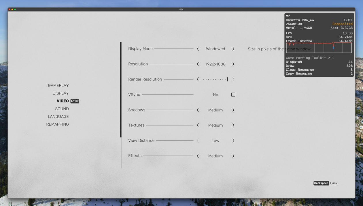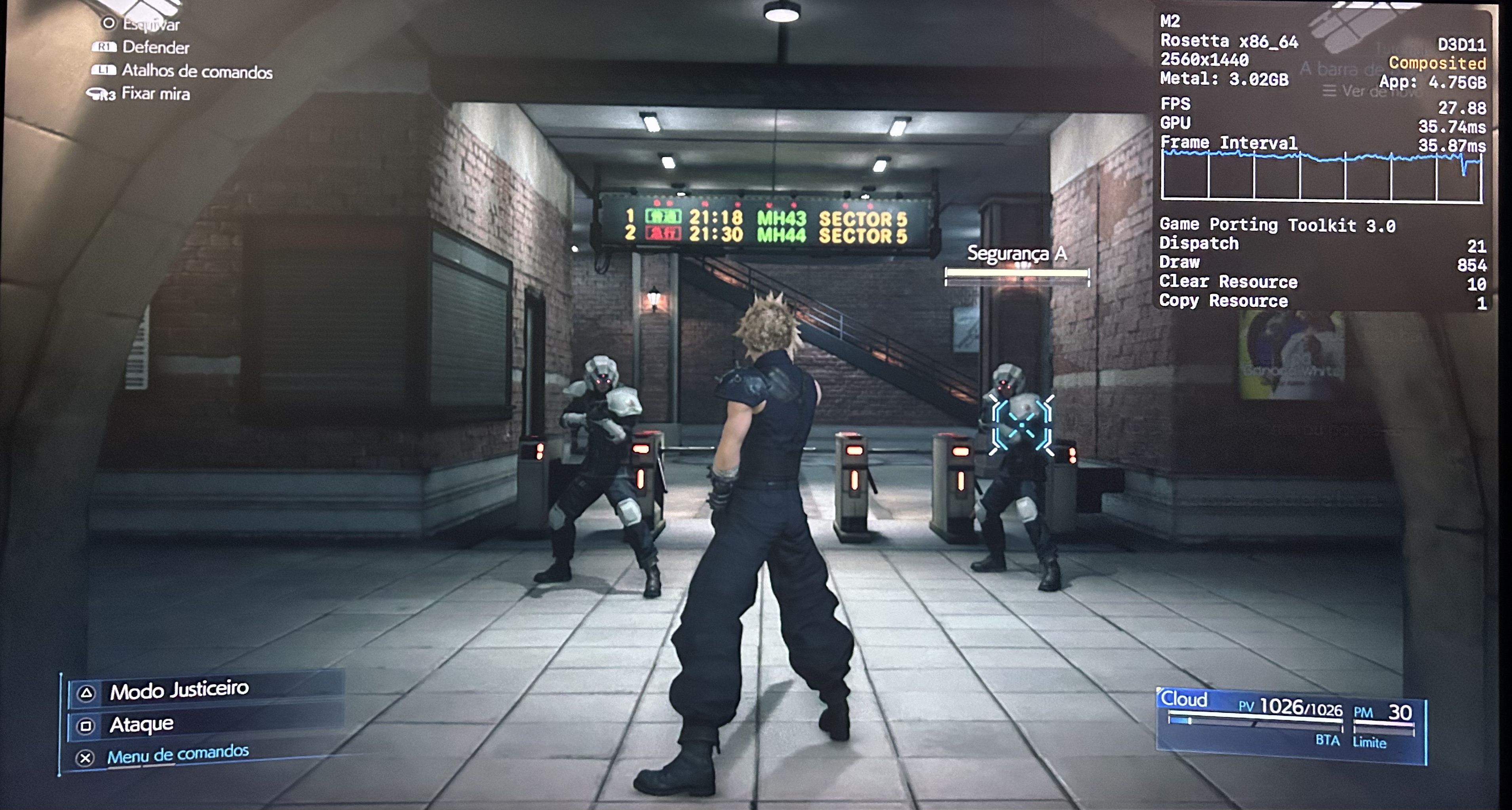 No meu Mac, o jogo rodou praticamente o tempo todo na casa dos 25-30qps, o que está longe de ser o ideal, mas ainda considero jogável pois o frame pacing não é ruim. Para tal, tive que reduzir as configurações gráficas ao máximo e colocar o jogo para rodar em 720p 2, além de selecionar o modo gráfico D3DMetal e o modo de sincronização MSync.