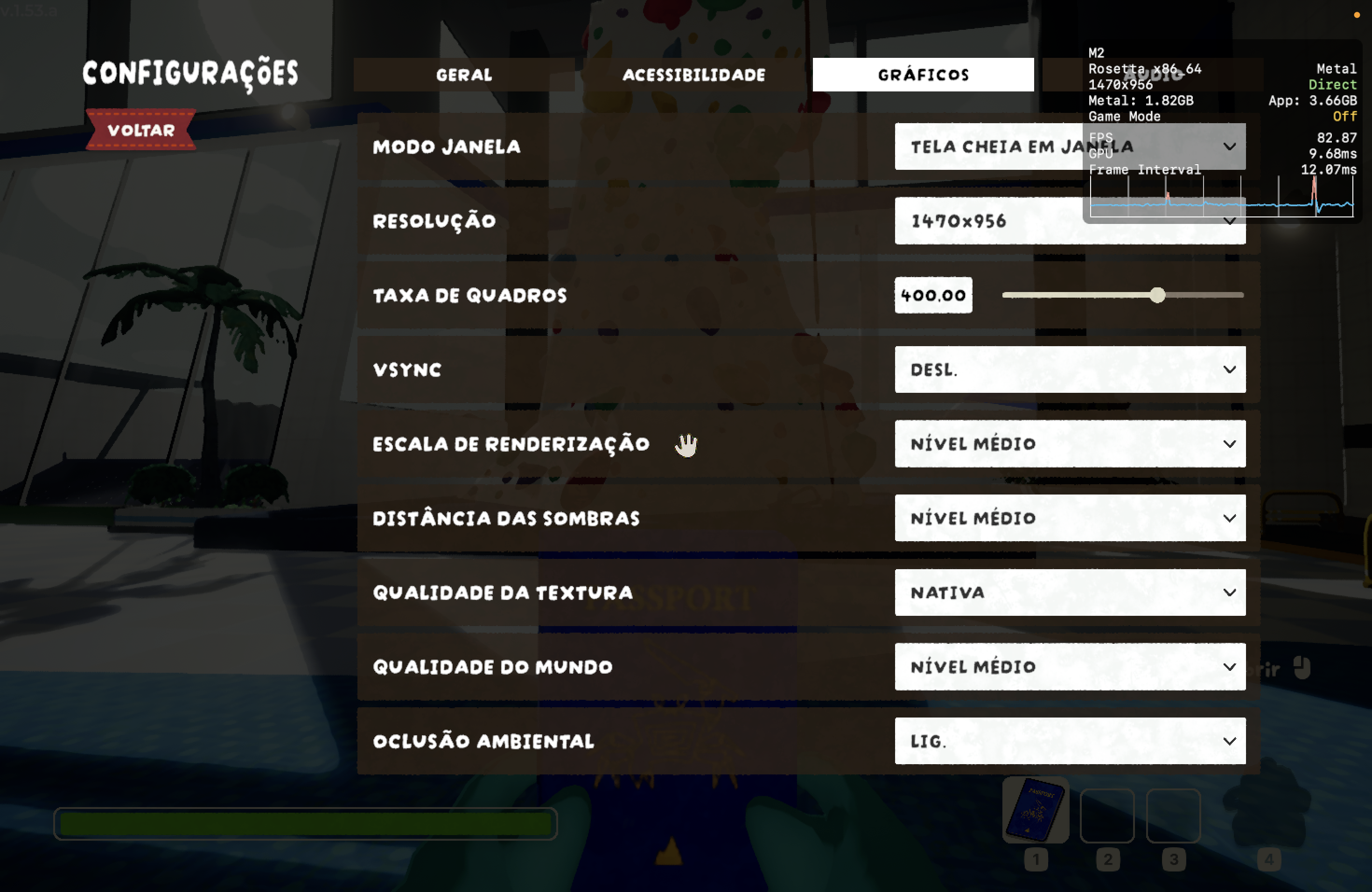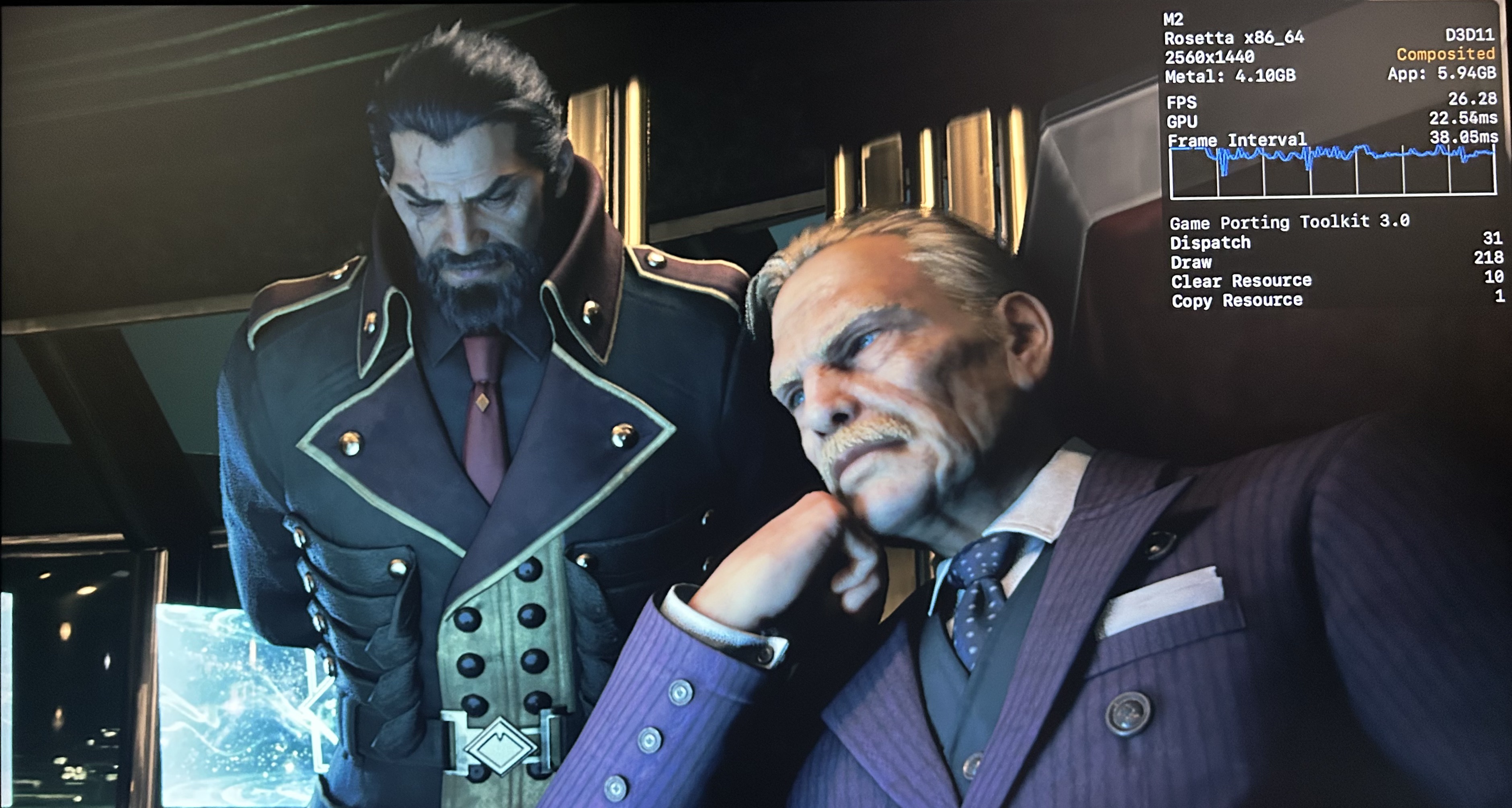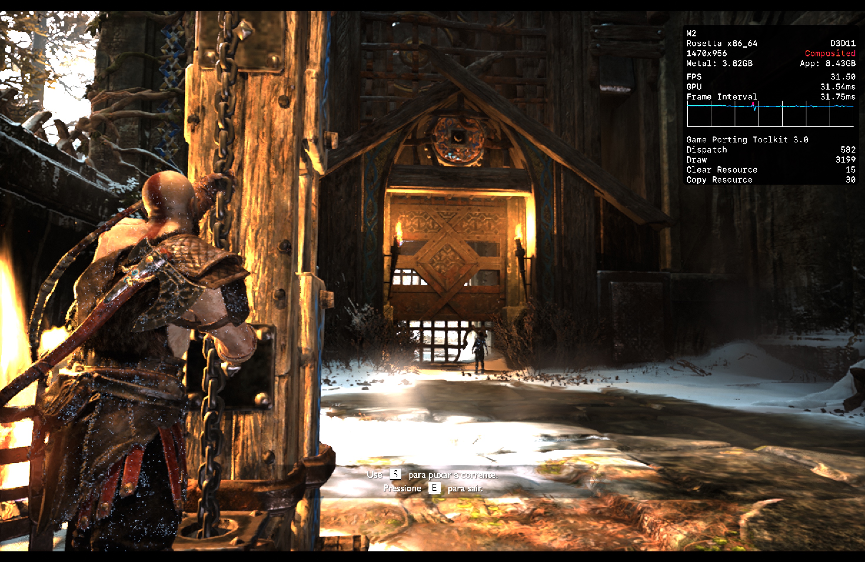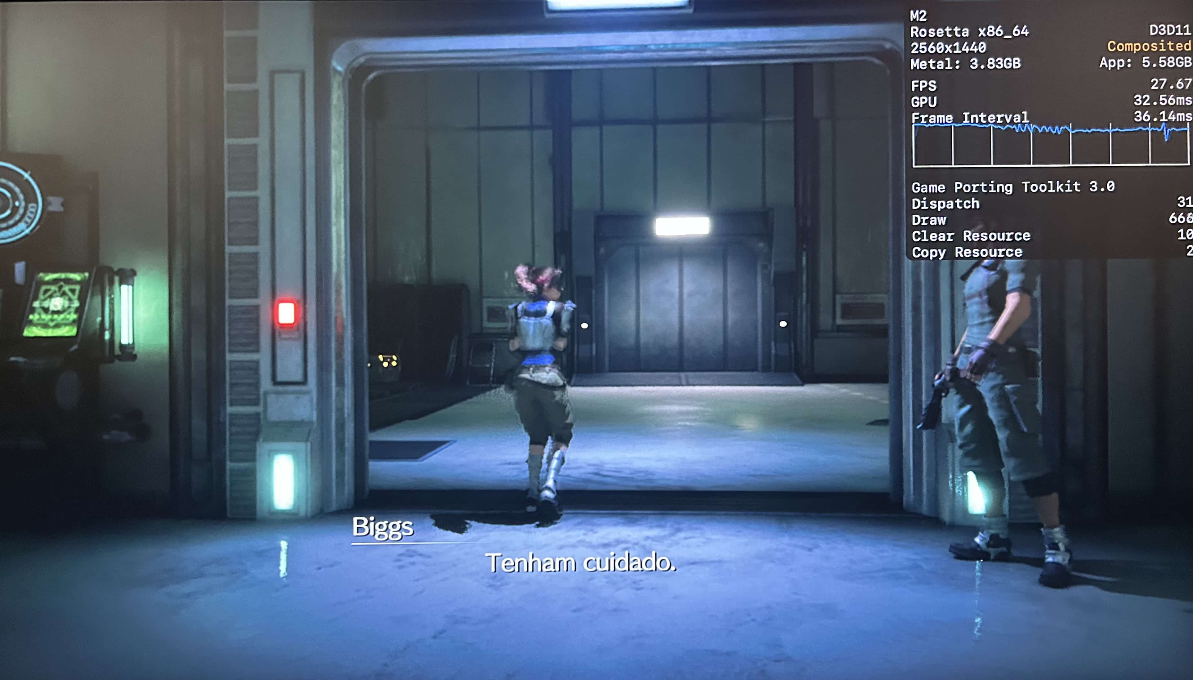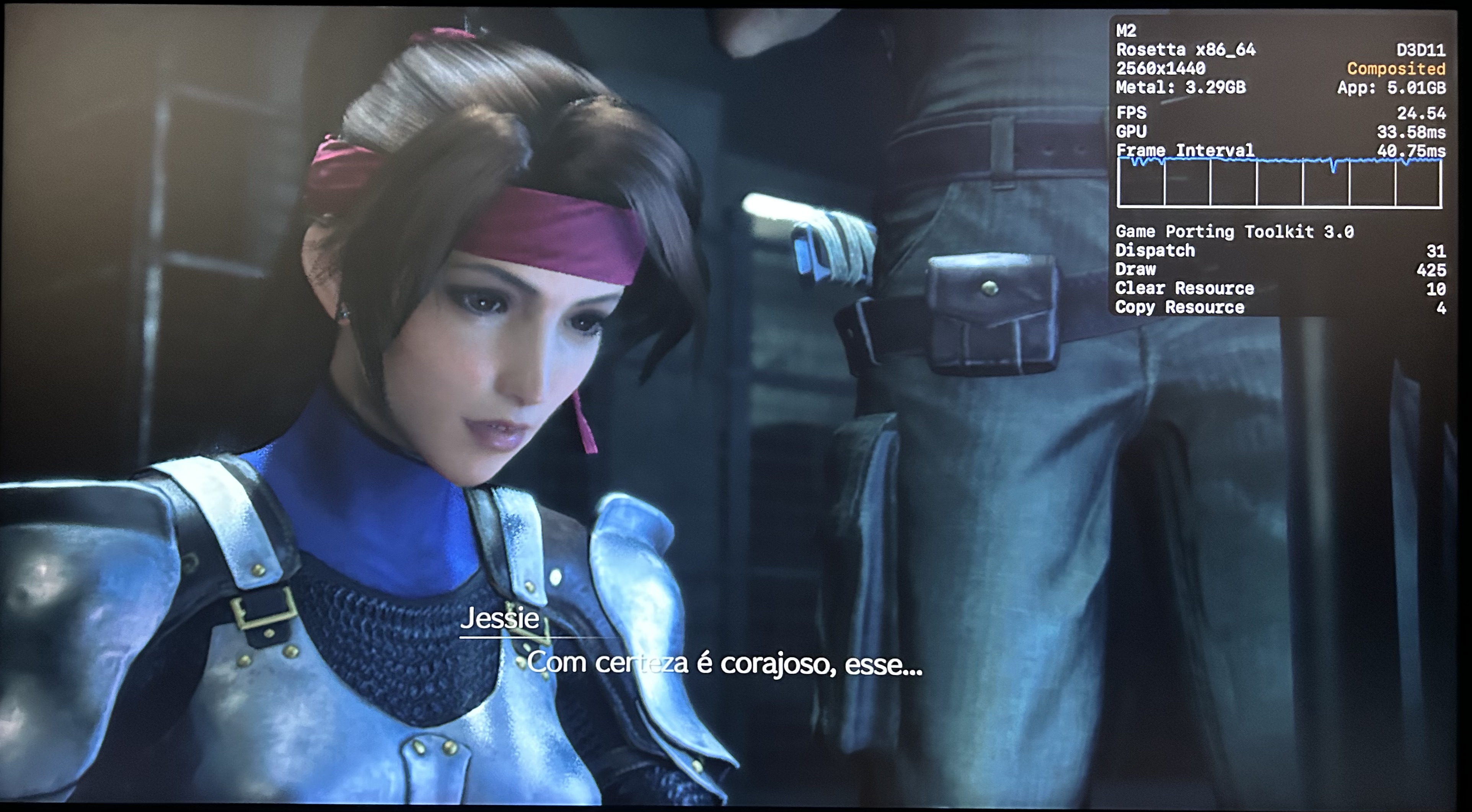 No meu Mac, o jogo rodou praticamente o tempo todo na casa dos 25-30qps, o que está longe de ser o ideal, mas ainda considero jogável pois o frame pacing não é ruim. Para tal, tive que reduzir as configurações gráficas ao máximo e colocar o jogo para rodar em 720p 2, além de selecionar o modo gráfico D3DMetal e o modo de sincronização MSync.
