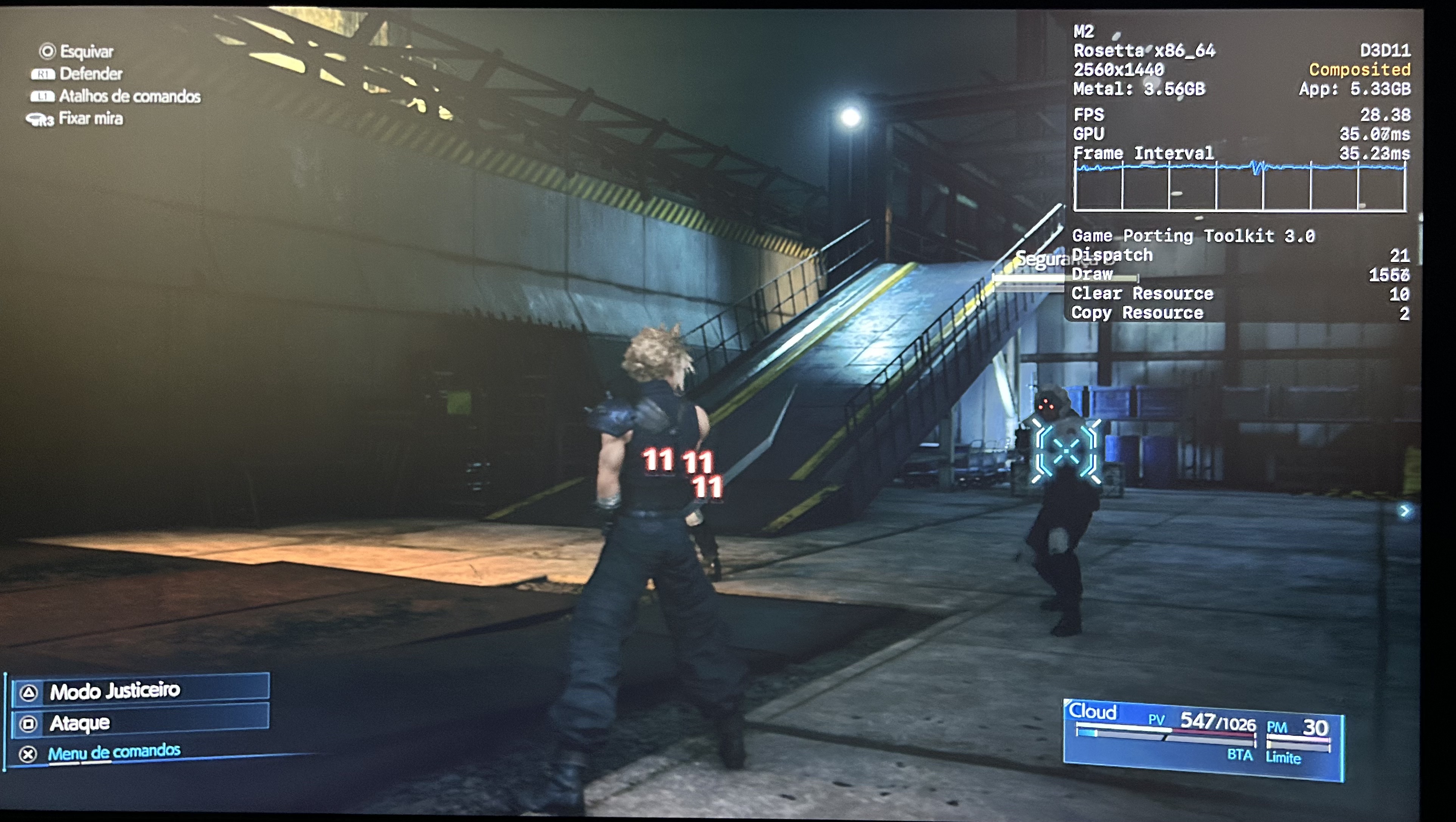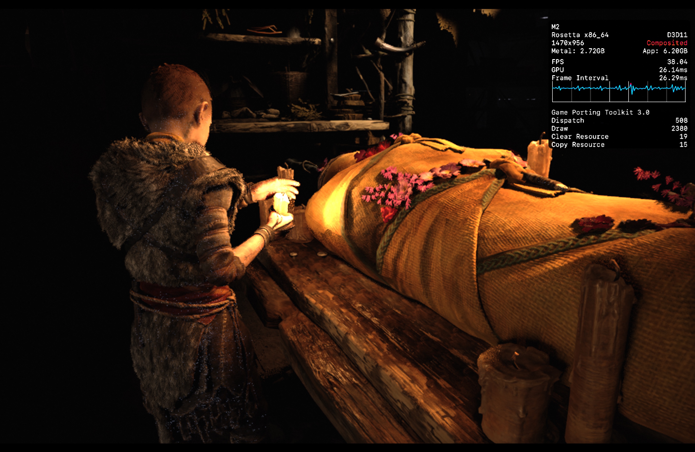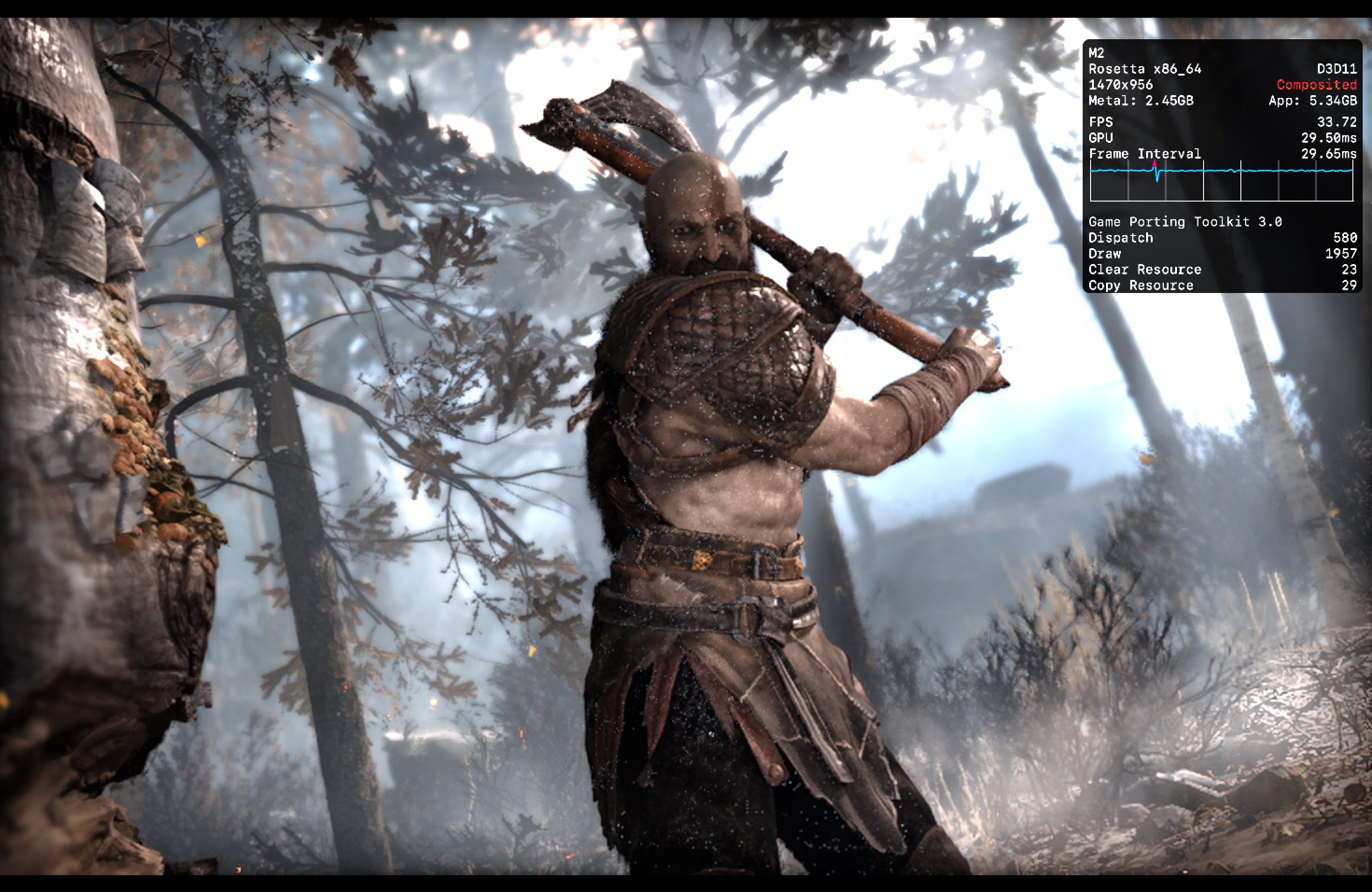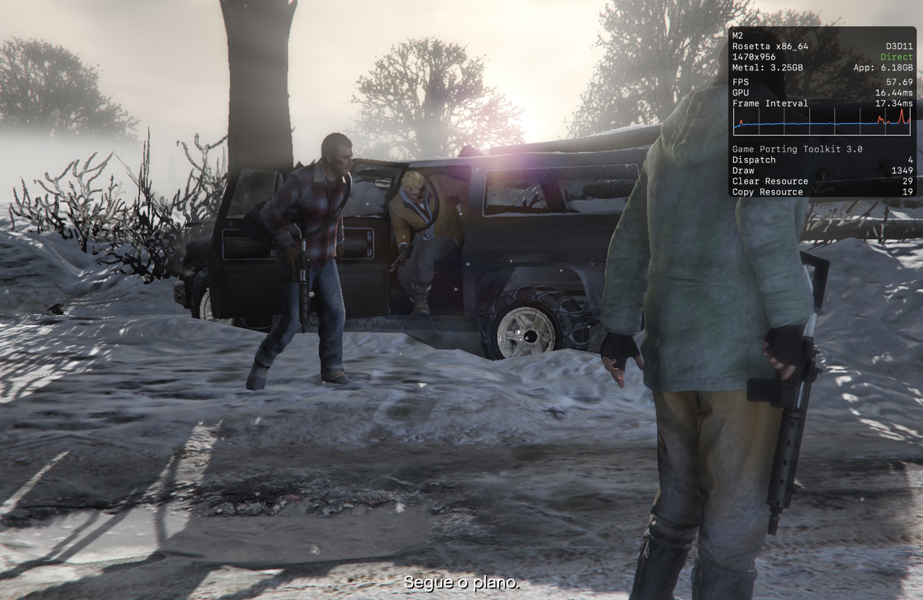 No meu Mac, o jogo rodou praticamente o tempo todo na casa dos 25-30qps, o que está longe de ser o ideal, mas ainda considero jogável pois o frame pacing não é ruim. Para tal, tive que reduzir as configurações gráficas ao máximo e colocar o jogo para rodar em 720p 2, além de selecionar o modo gráfico D3DMetal e o modo de sincronização MSync.