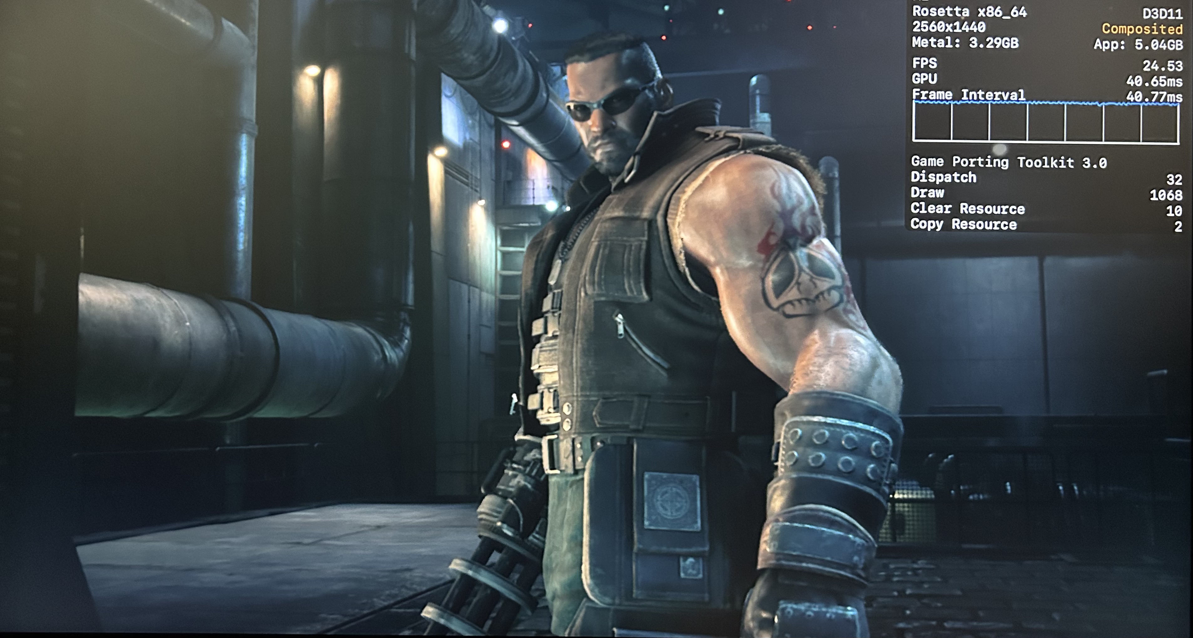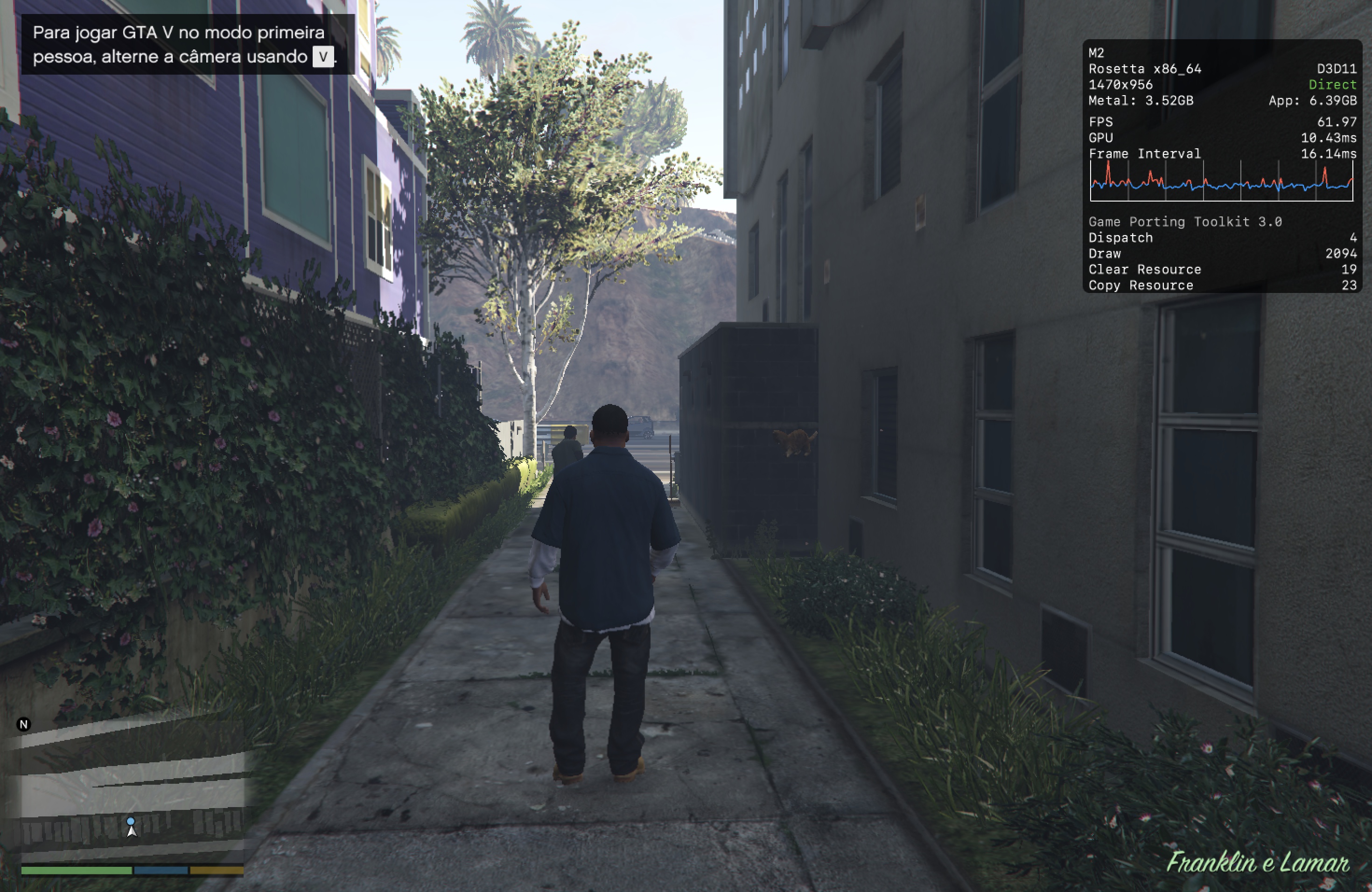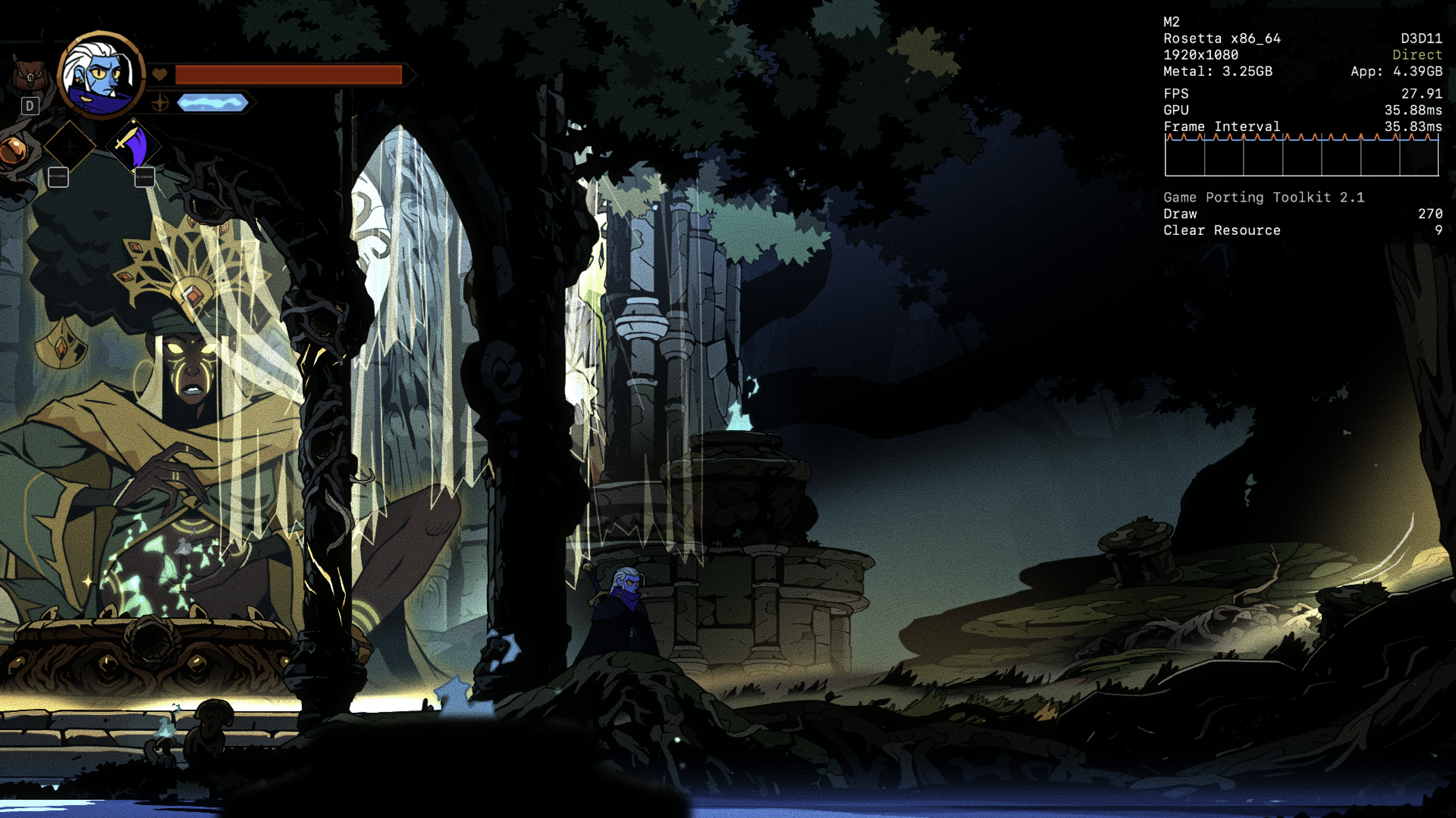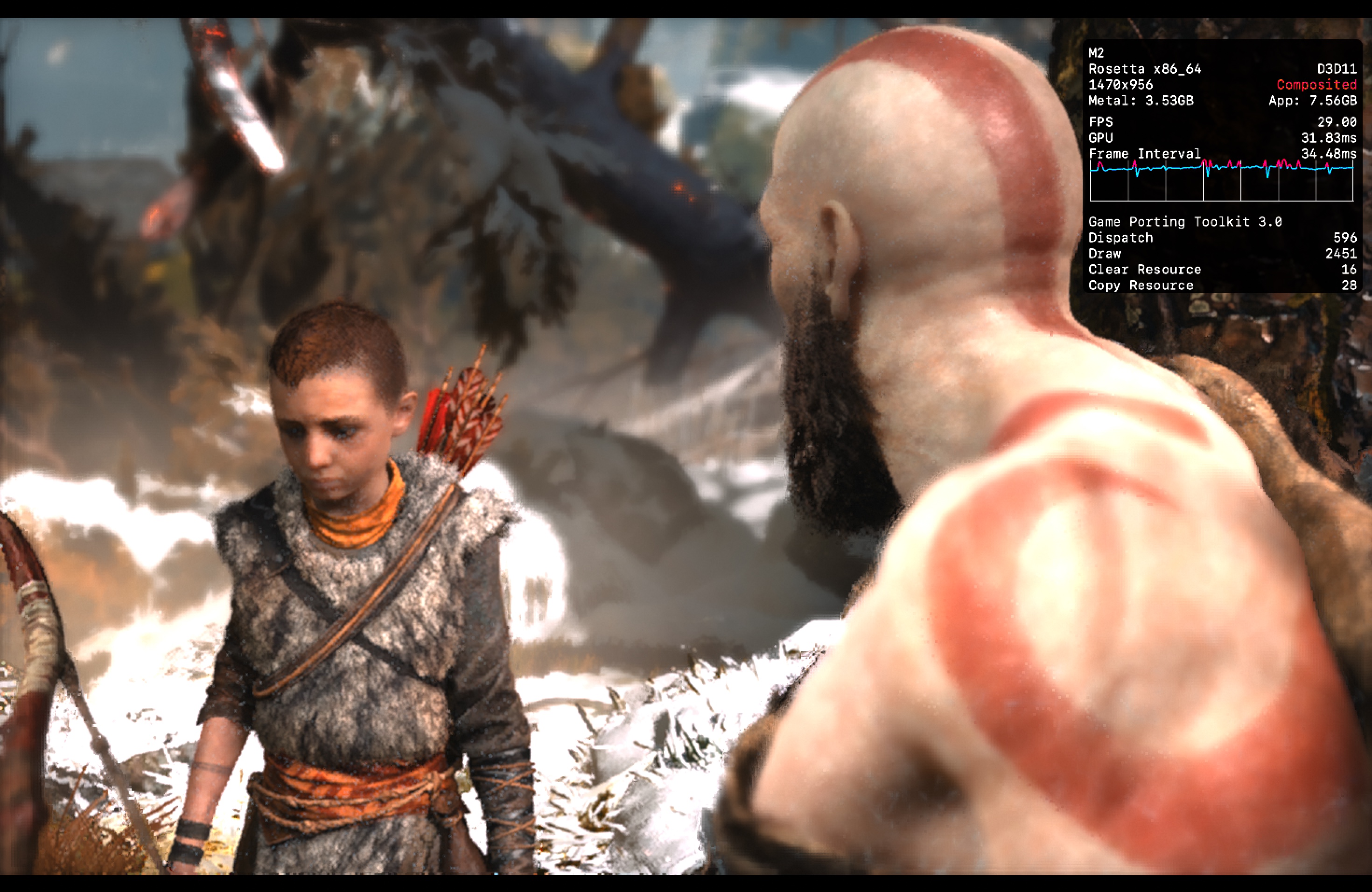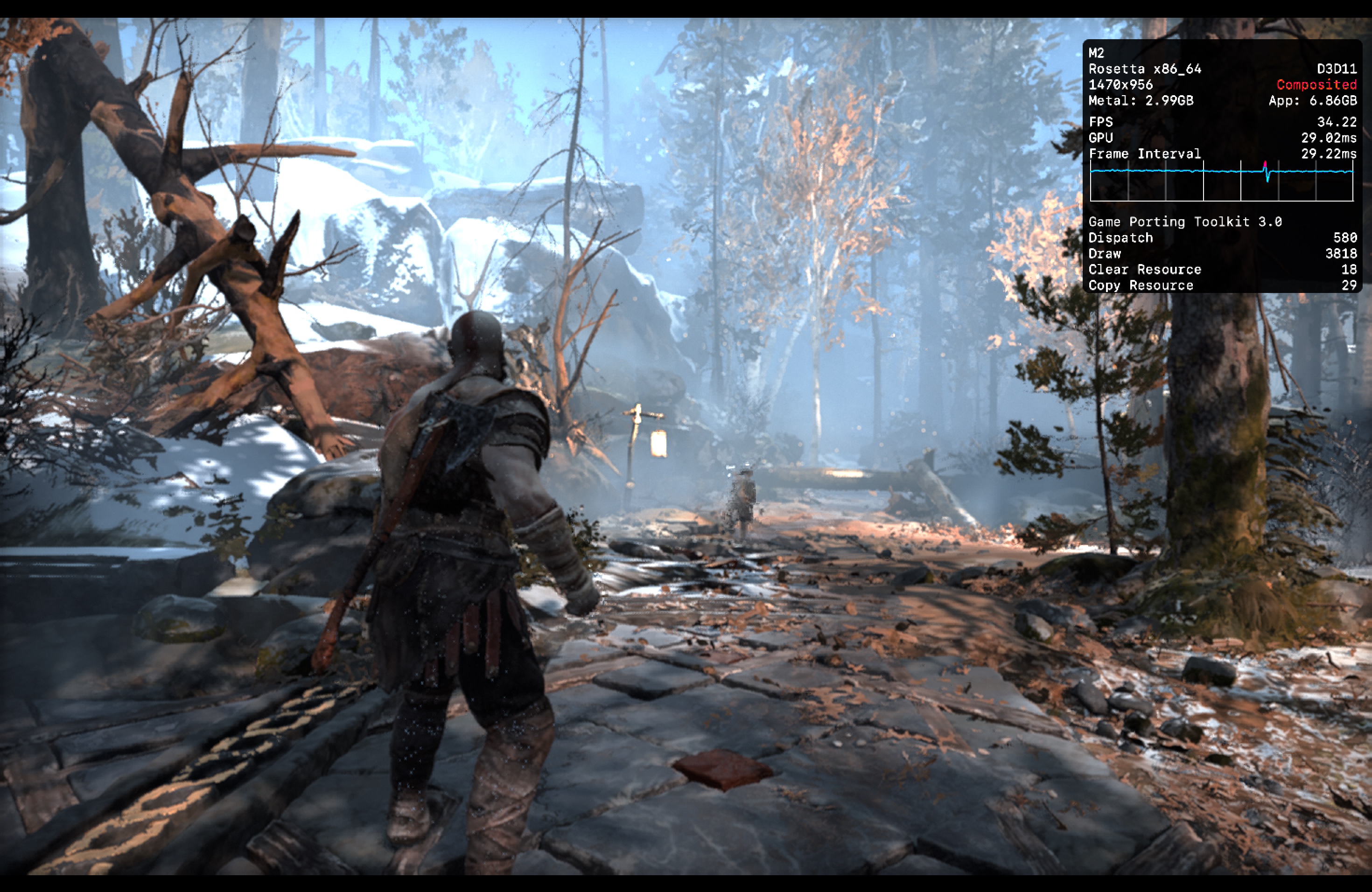 No meu Mac, o jogo rodou praticamente o tempo todo na casa dos 25-30qps, o que está longe de ser o ideal, mas ainda considero jogável pois o frame pacing não é ruim. Para tal, tive que reduzir as configurações gráficas ao máximo e colocar o jogo para rodar em 720p 2, além de selecionar o modo gráfico D3DMetal e o modo de sincronização MSync.