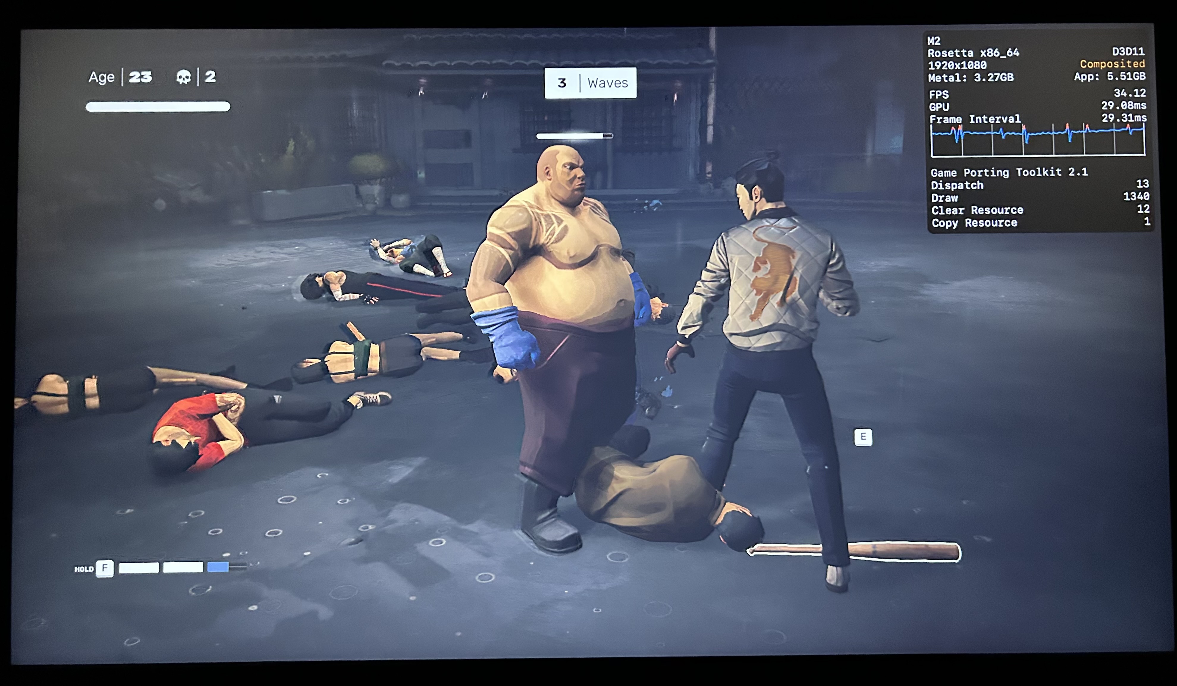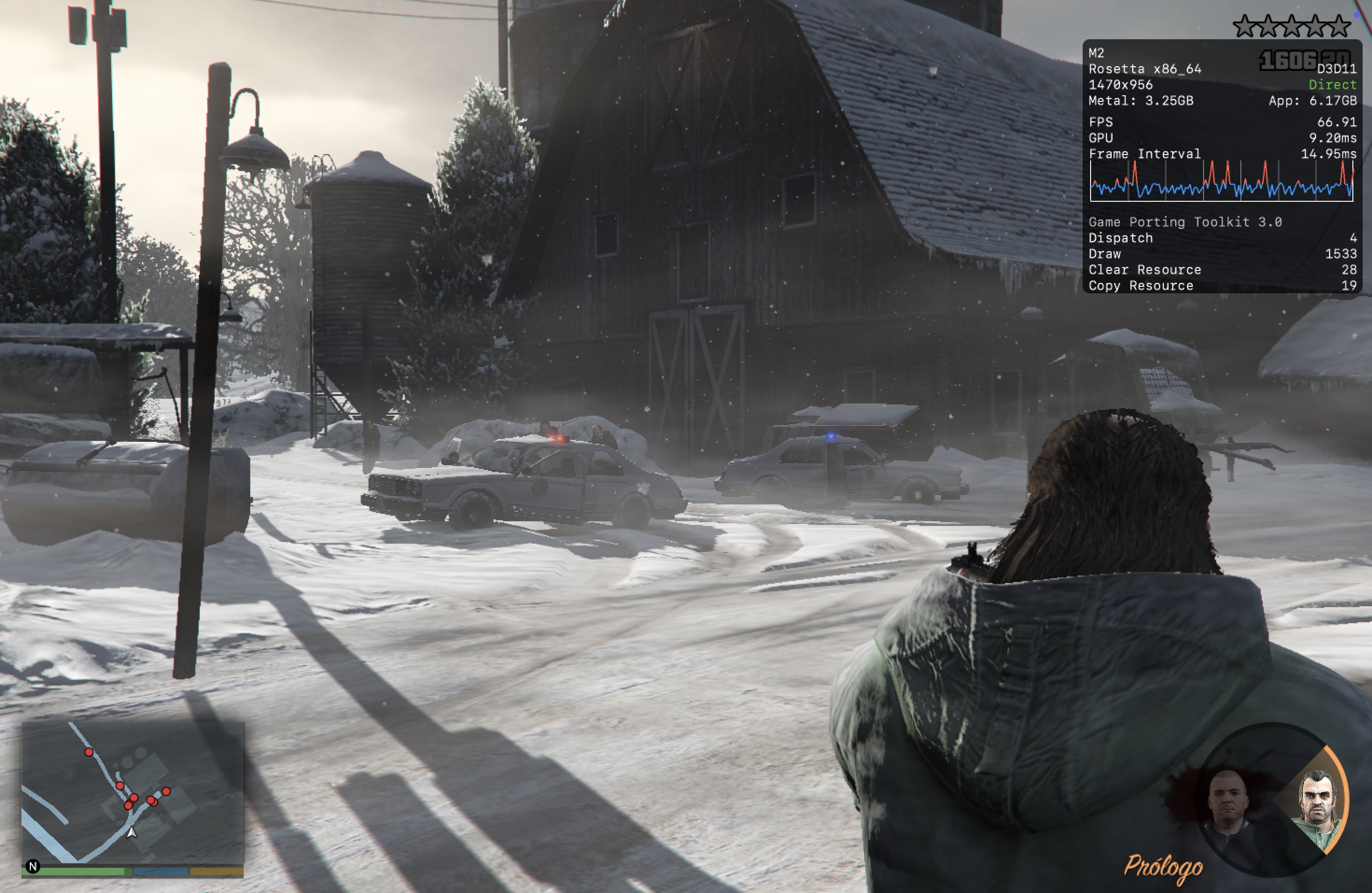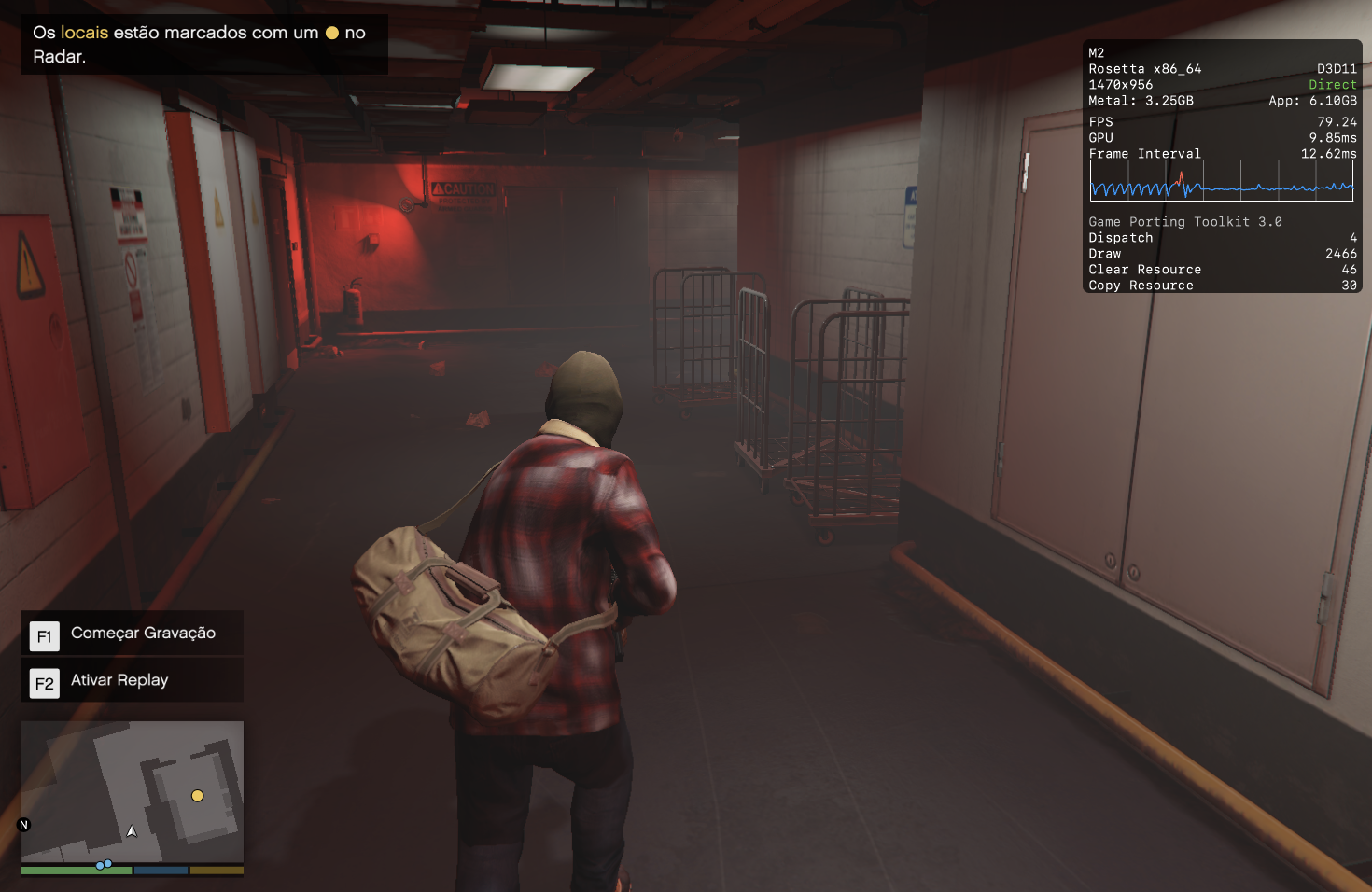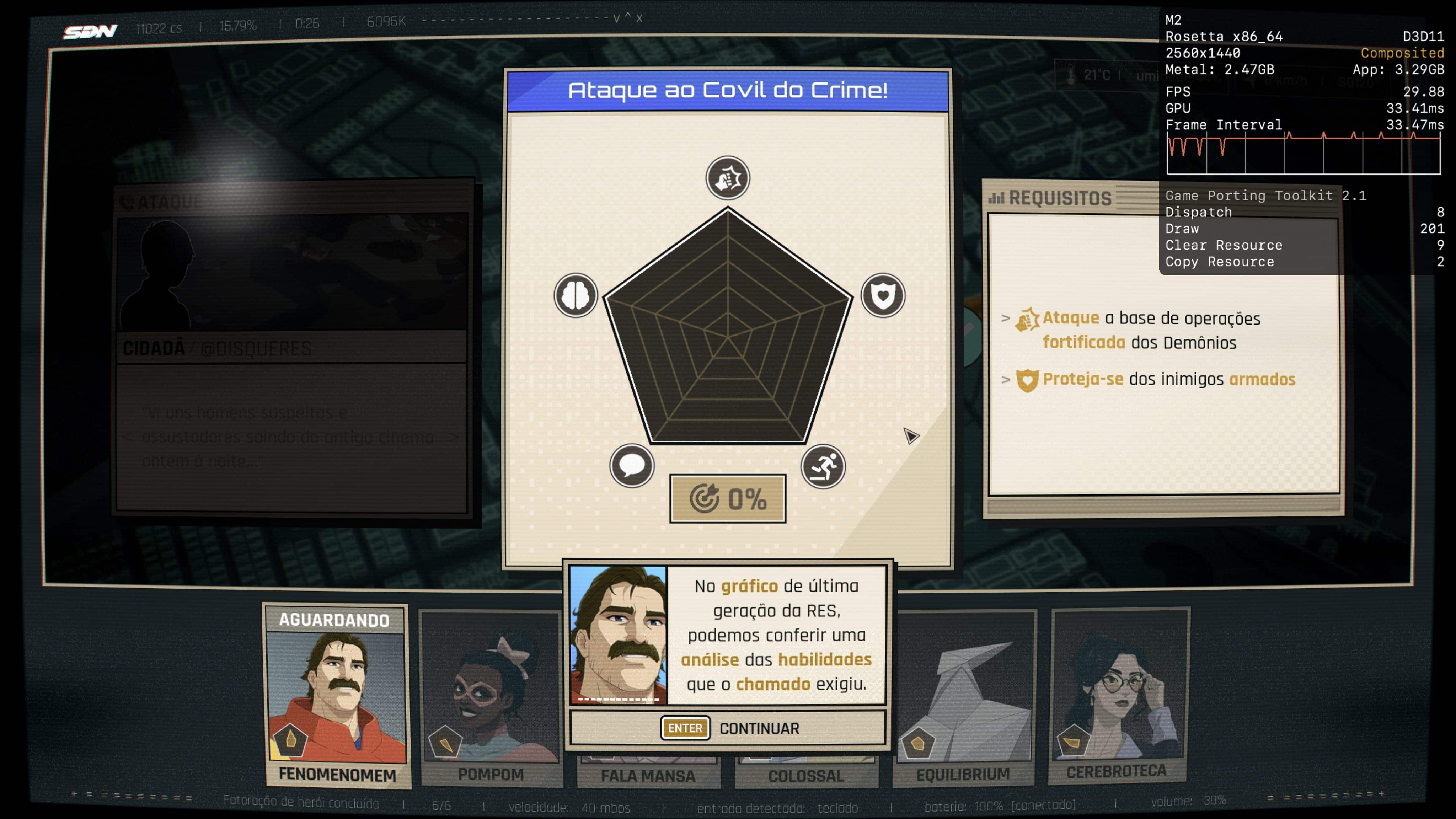 No meu Mac, o jogo rodou praticamente o tempo todo na casa dos 25-30qps, o que está longe de ser o ideal, mas ainda considero jogável pois o frame pacing não é ruim. Para tal, tive que reduzir as configurações gráficas ao máximo e colocar o jogo para rodar em 720p 2, além de selecionar o modo gráfico D3DMetal e o modo de sincronização MSync.