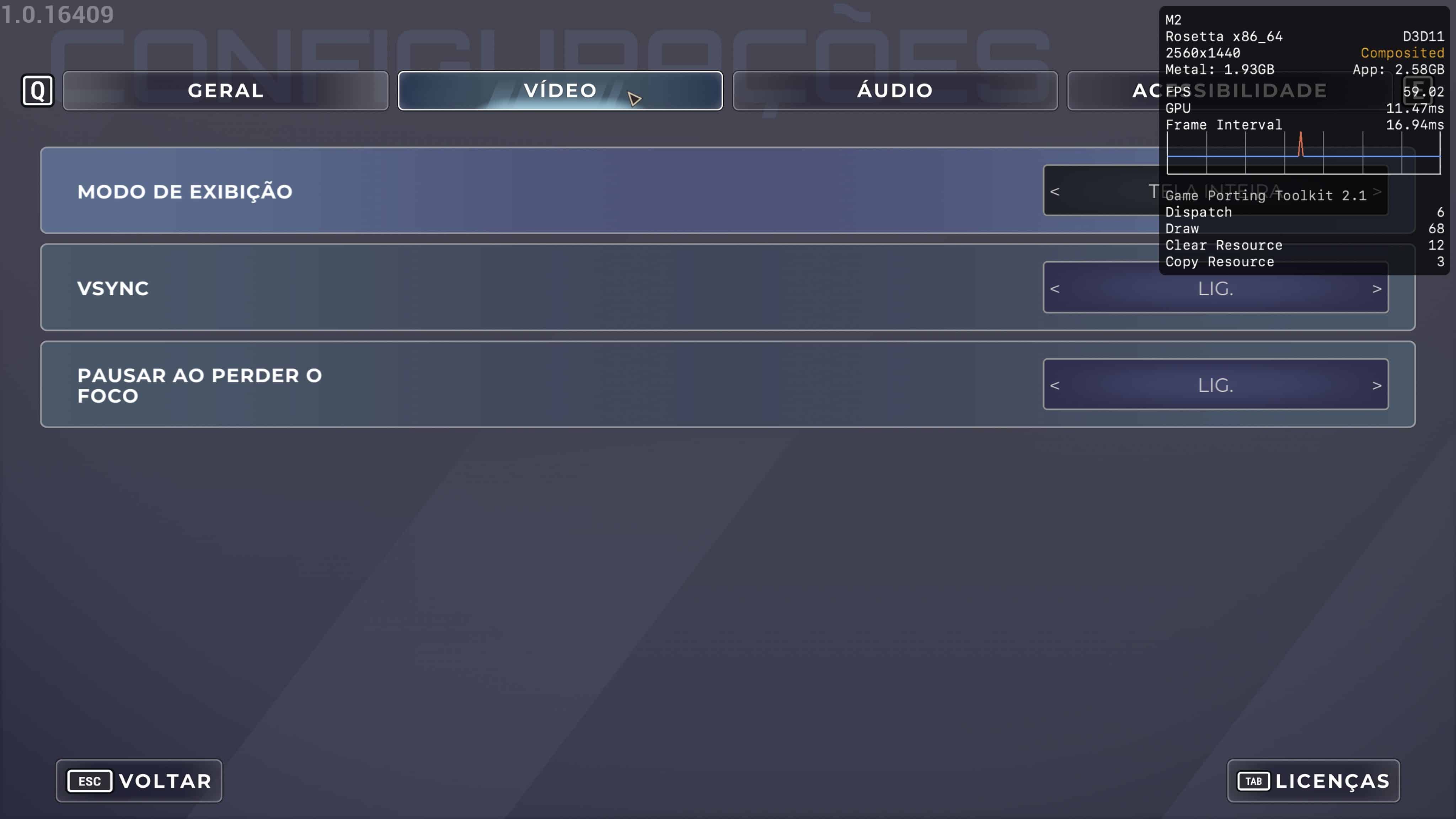 Uns 16GB de memória provavelmente já seriam suficientes para desbloquear uma performance mais estável, principalmente com o modo gráfico D3DMetal e o modo de sincronização MSync selecionados.