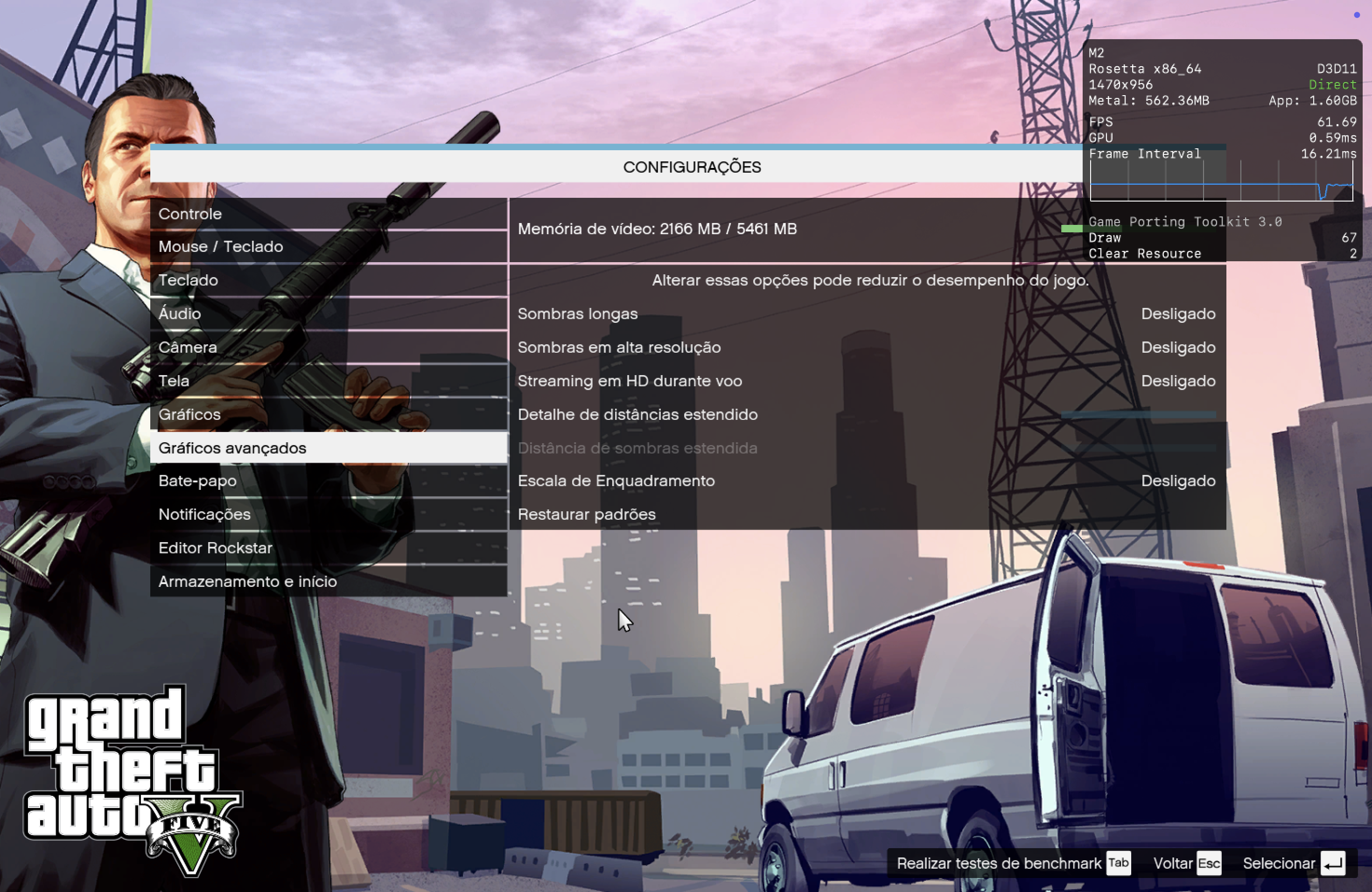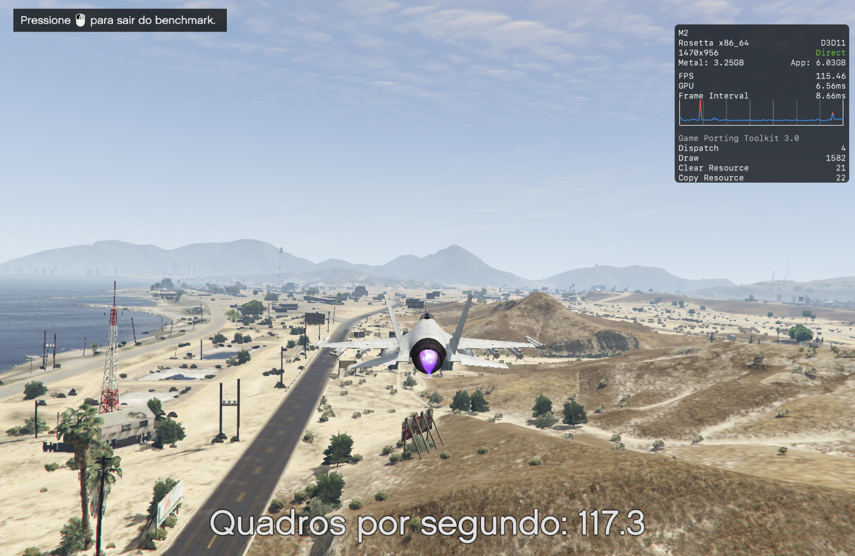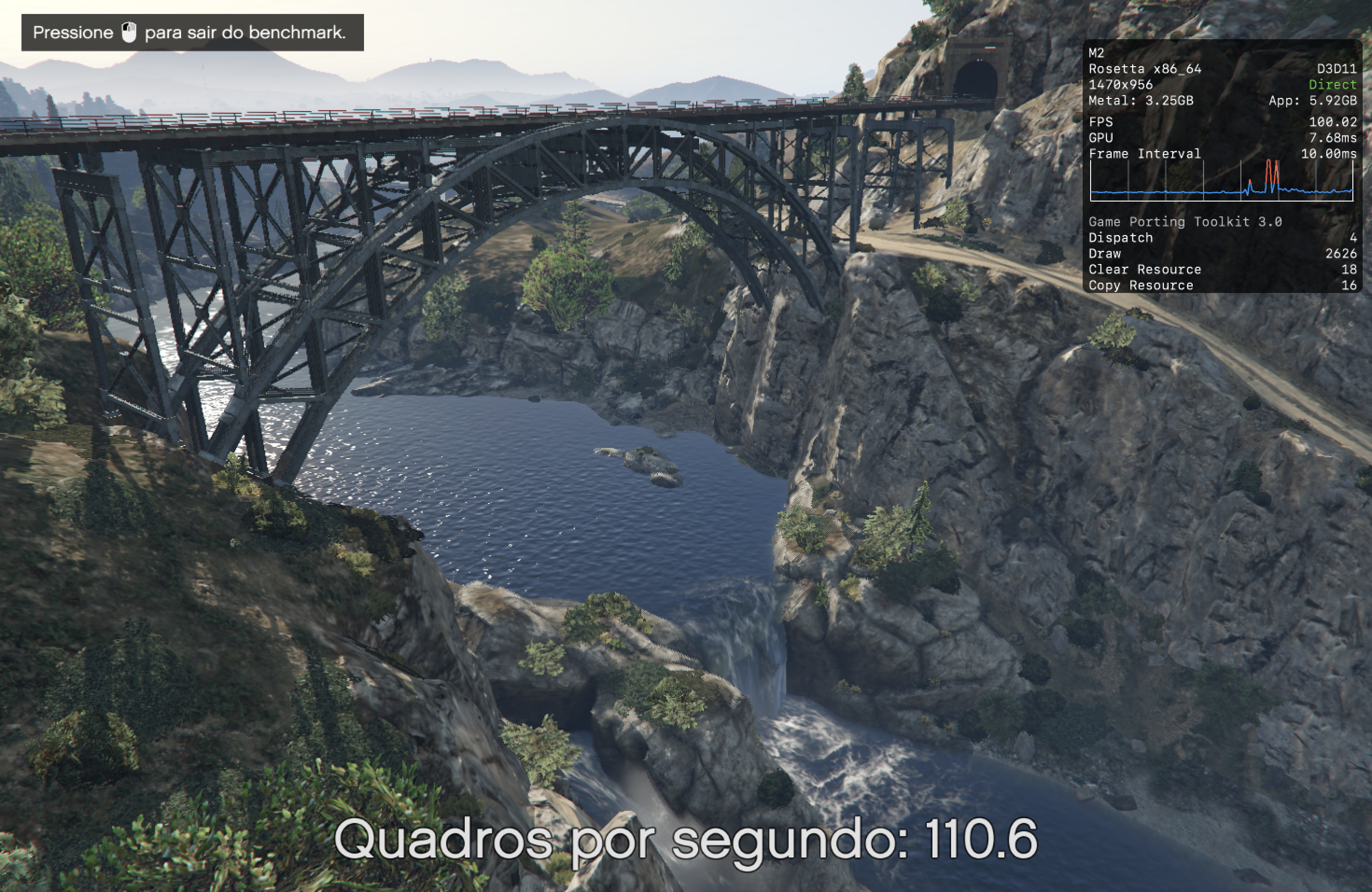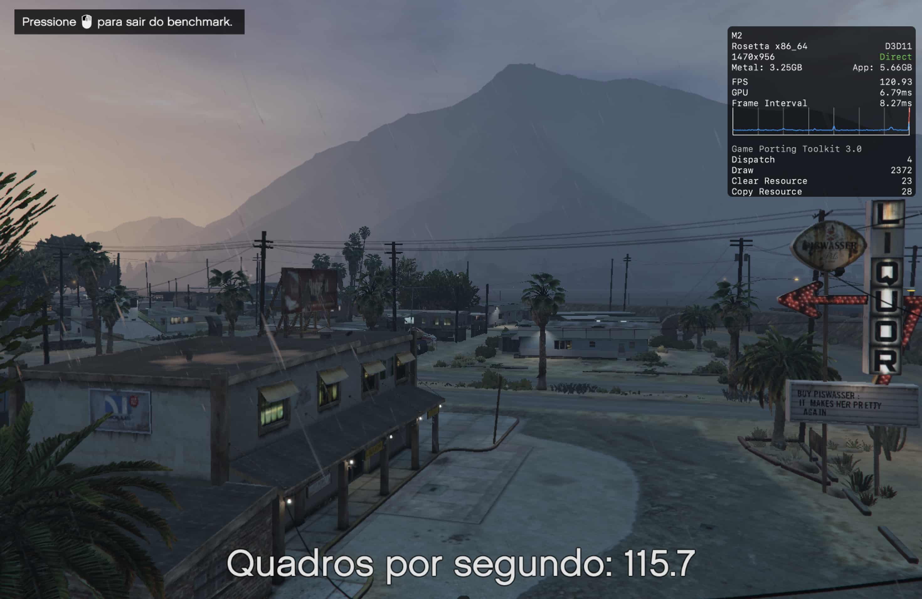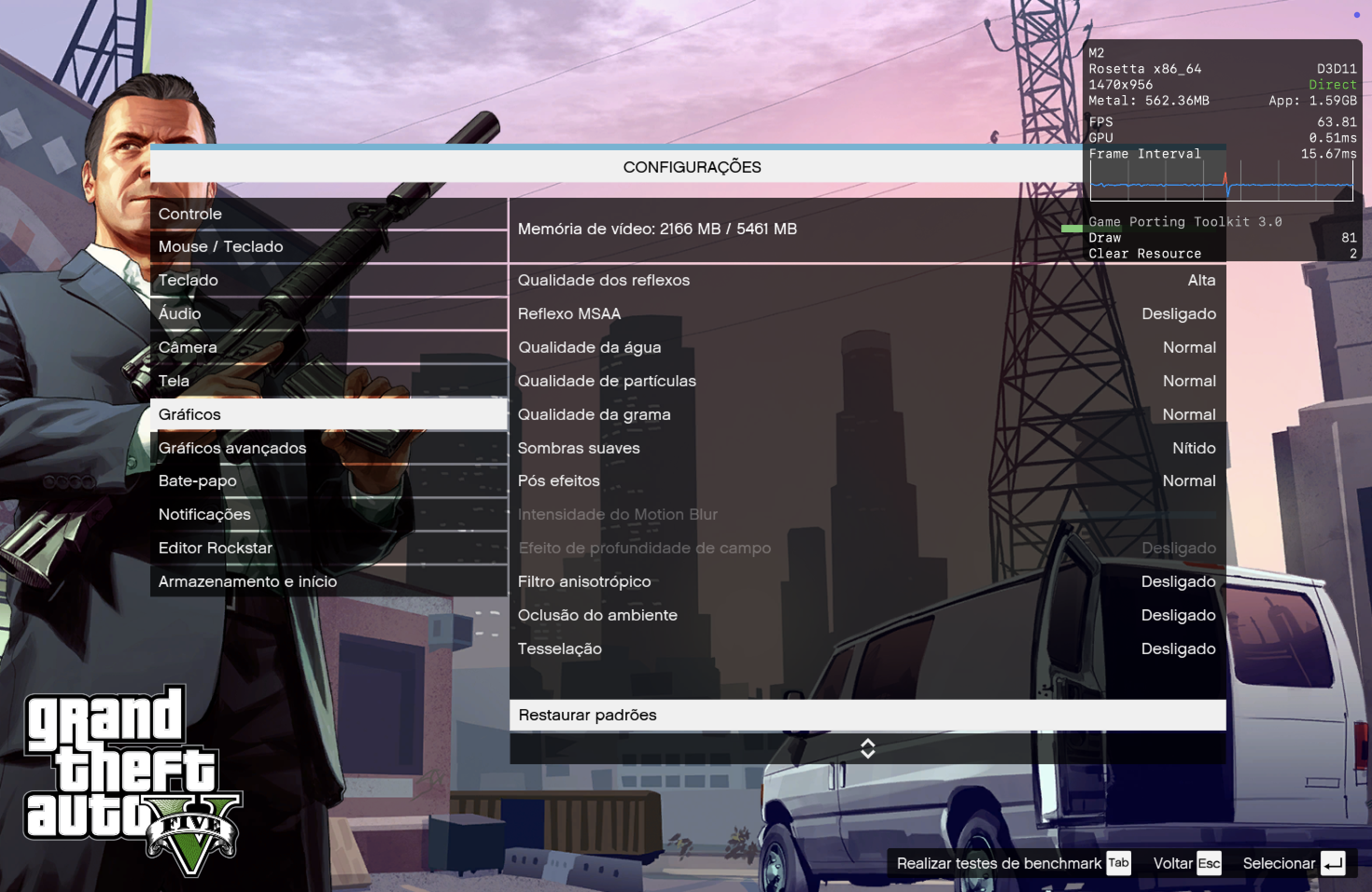 Aqui, a melhor performance foi obtida com os modos D3DMetal e ESync ativados.