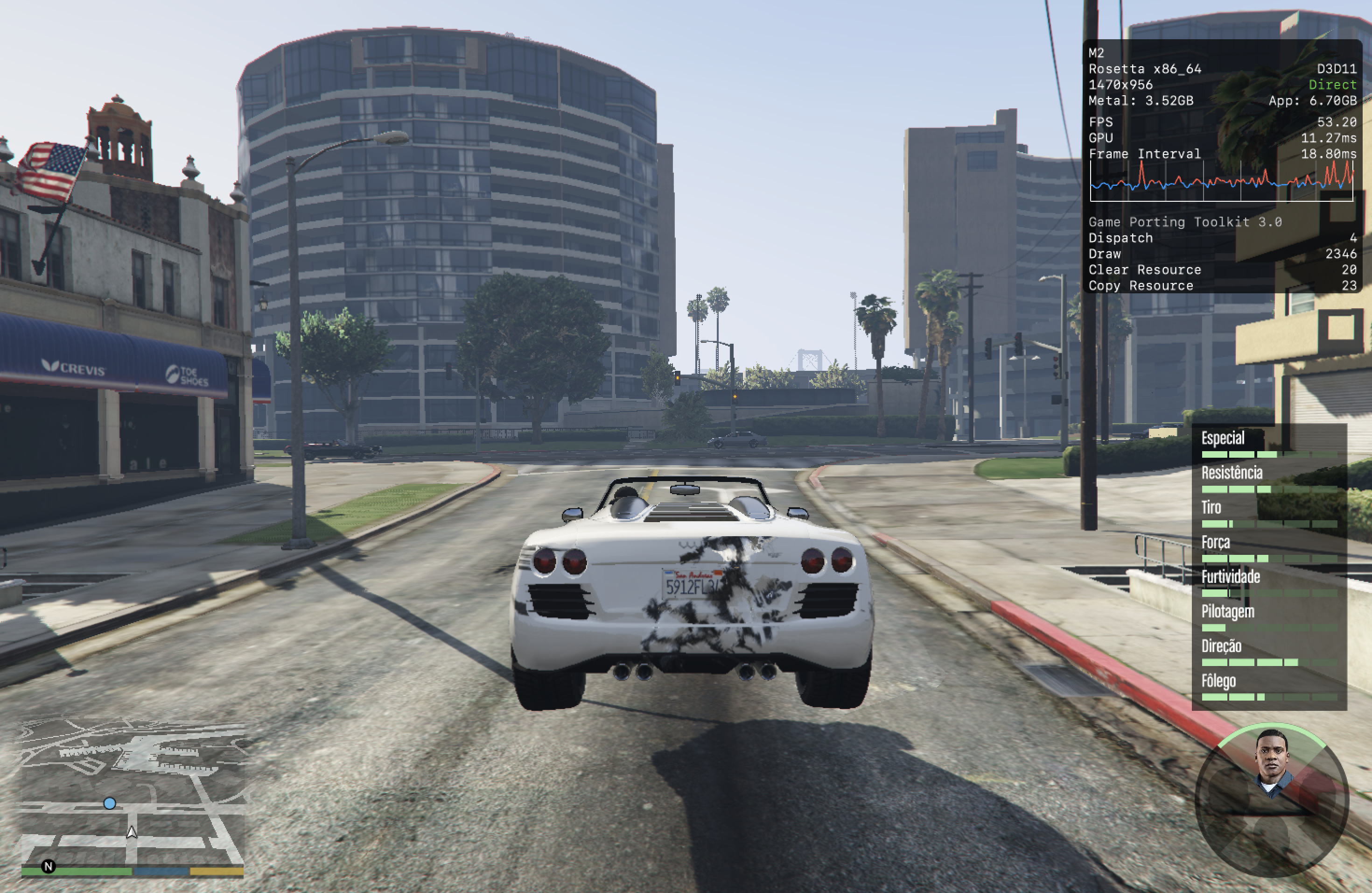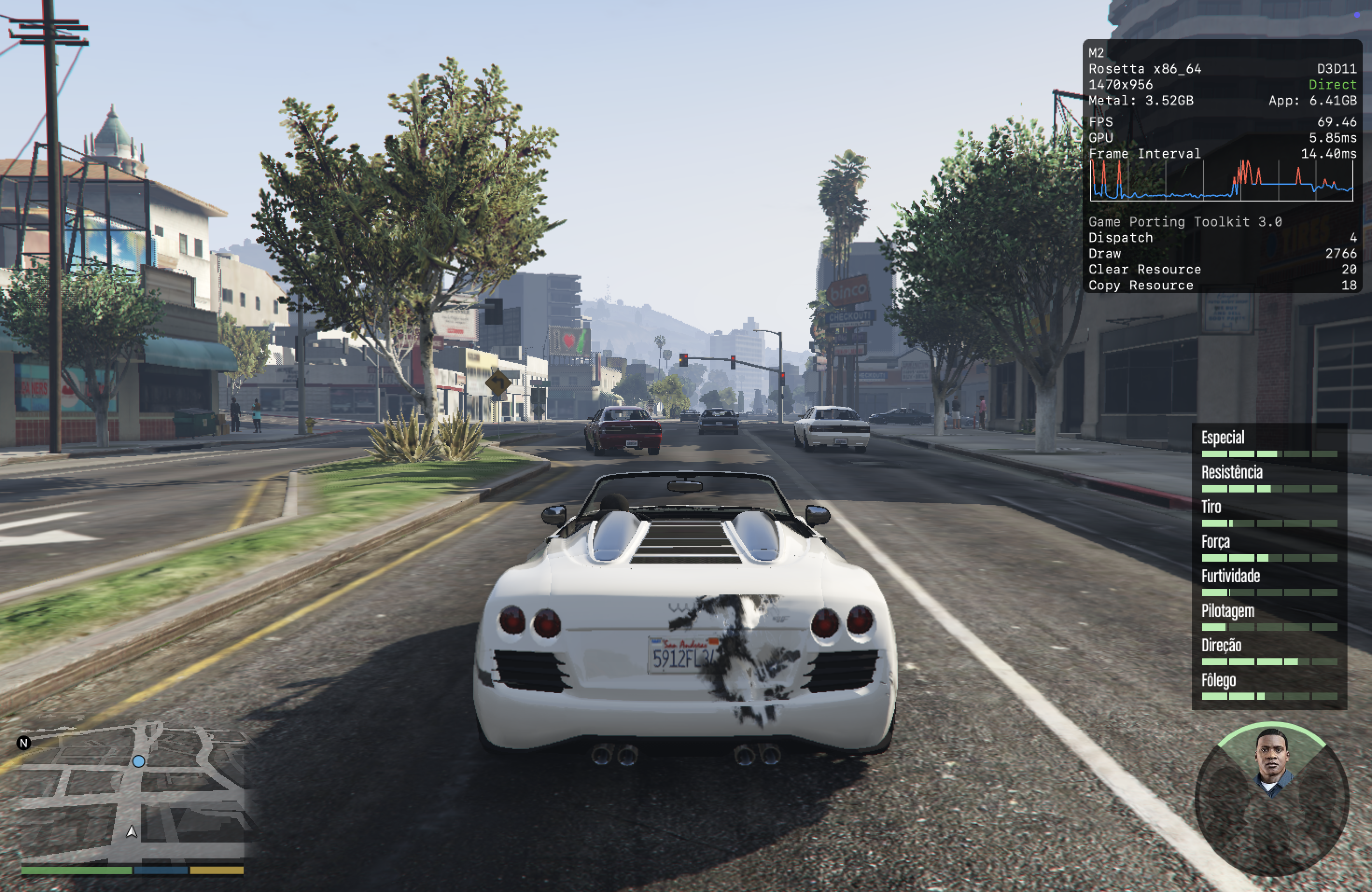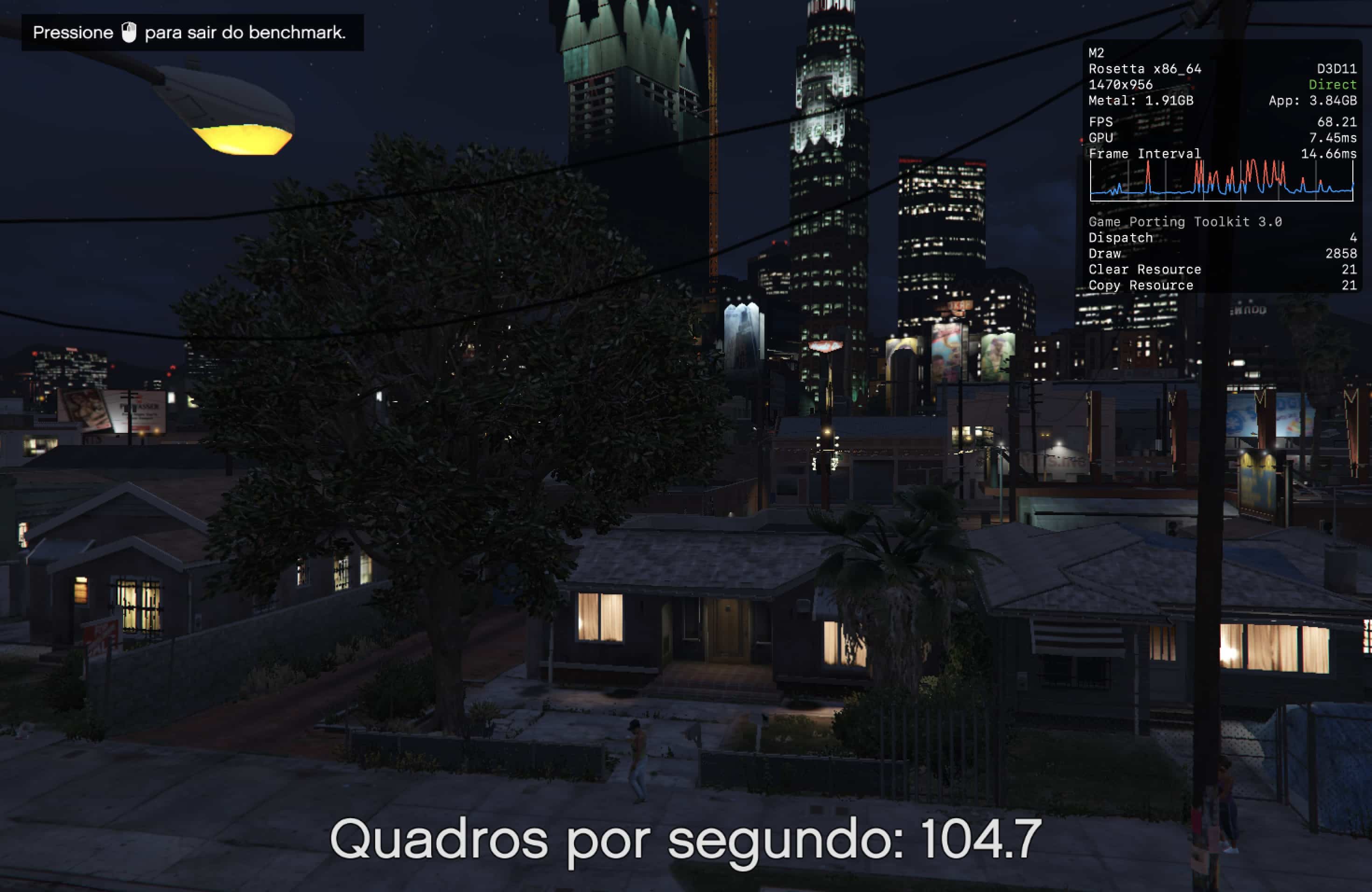Durante a gameplay real, contudo, esse número flutuou entre 60-80qps (o que ainda é muito bom), e quedas abaixo de 60qps foram bem raras. De qualquer forma, é bem possível que esses números tivessem sido ainda melhores caso o jogo me deixasse alterar a resolução de renderização, que ficava bloqueada em 1470×1176 pixels sempre que eu selecionava o modo D3DMetal (de longe, o que entregava a melhor performance) por algum motivo.