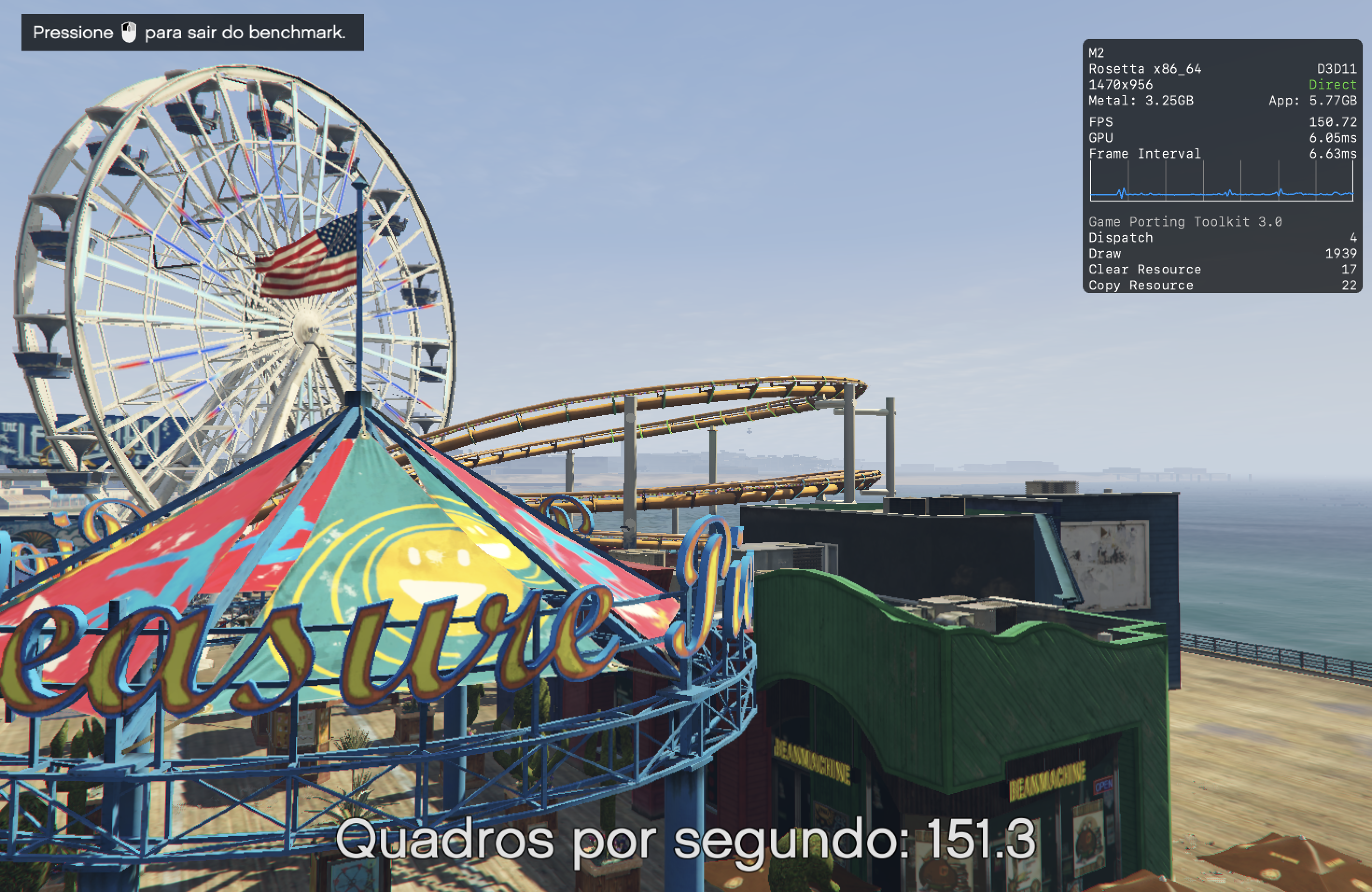 Depois que tudo é devidamente ajustado, a experiência torna-se bem satisfatória. Com o modo gráfico D3DMetal e o modo de sincronização MSync selecionados, o jogo atingiu a marca dos 150 quadros por segundo no meu MacBook Air (M2) — que tem apenas 8GB de memória e 256GB de armazenamento — enquanto rodava o benchmark embutido.