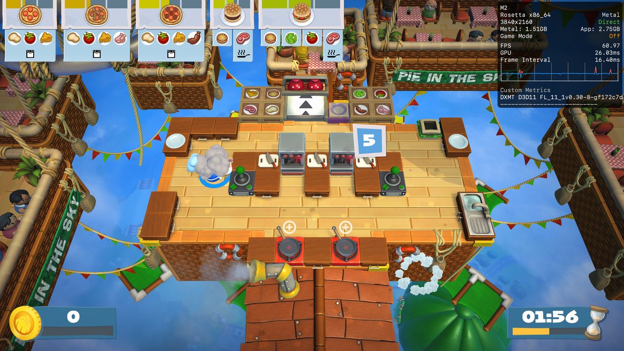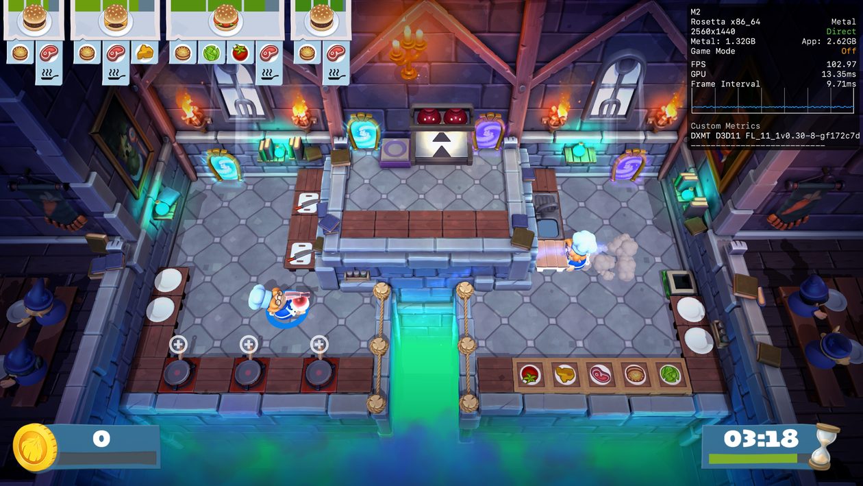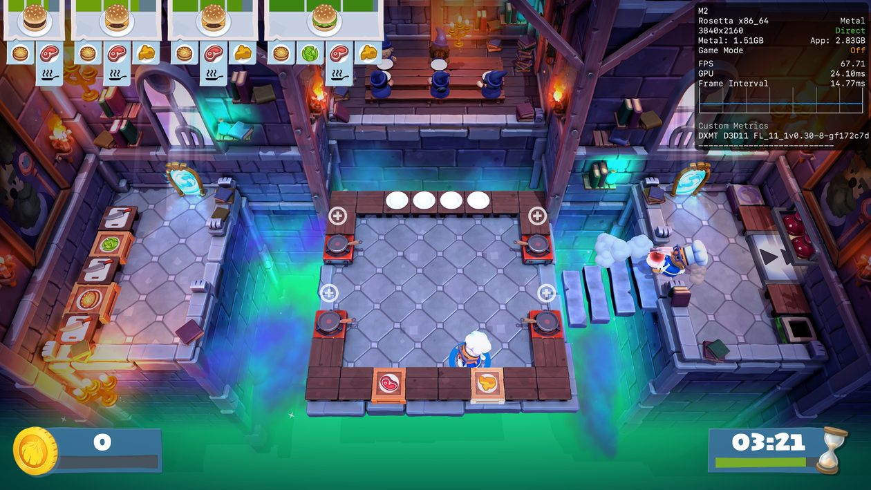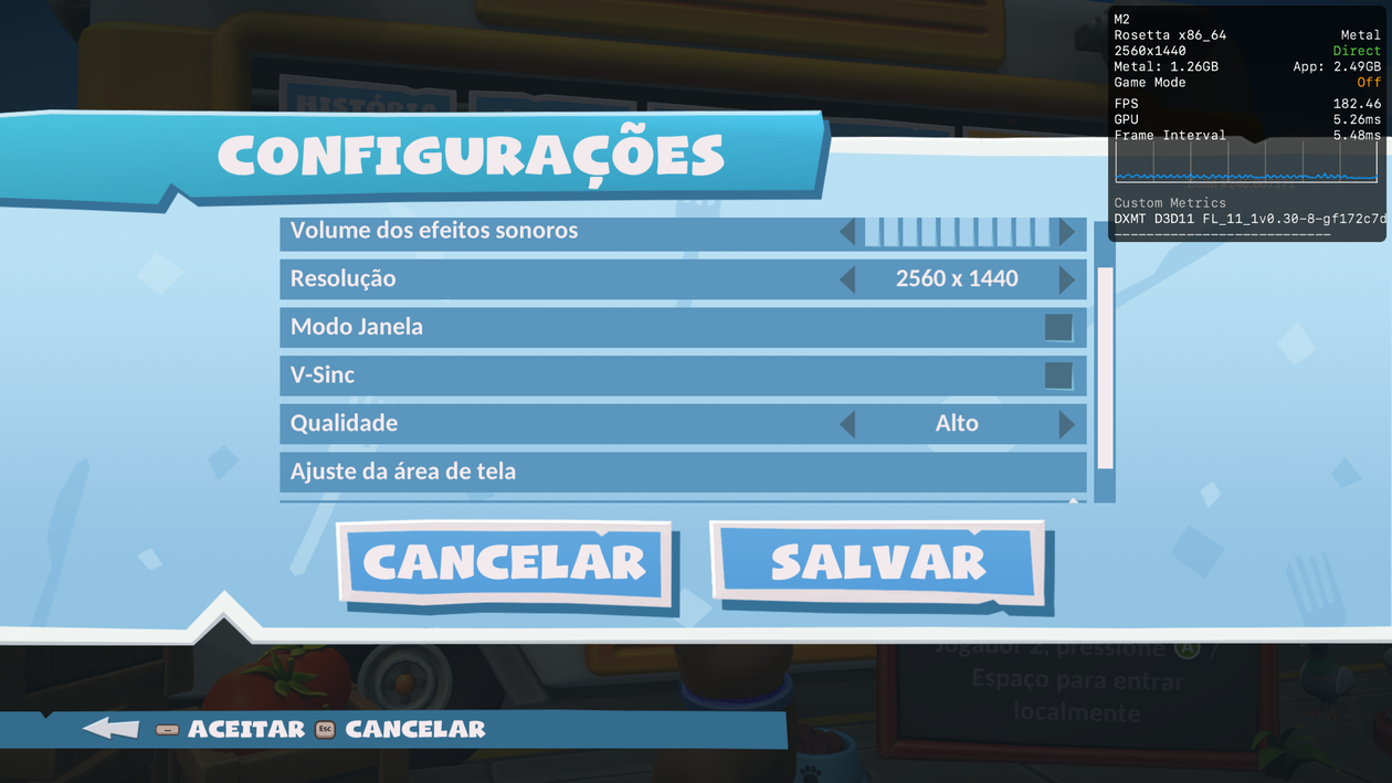 De qualquer maneira, se você quer se divertir com seus amigos — seja localmente ou online — e só tem o seu Mac ao seu dispor, saiba que Overcooked 2 é uma bela pedida. Apenas certifique-se de escolher o modo gráfico DXMT nos ajustes do CrossOver (ativar o MSync não foi necessário).