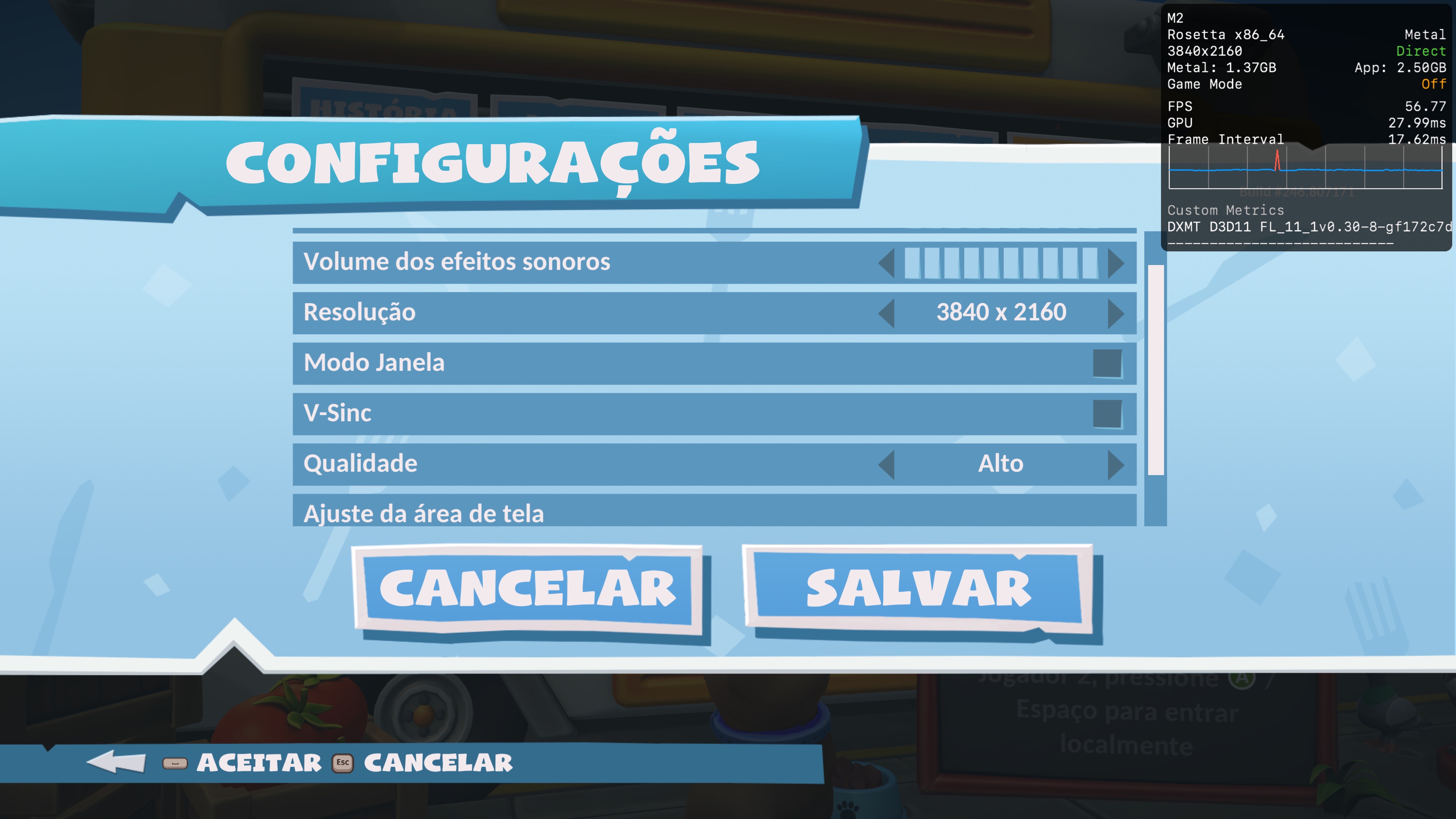 No meu Air, o game rodou tão bem que pareceria um app nativo. Na resolução de 2560×1440 pixels (popularmente conhecida como 2K) e com as configurações gráficas no alto, ele ficou praticamente o tempo todo na casa dos 180qps em temas como “Balões do Bufê”, caindo para algo em torno de 100-125qps em níveis como “A Cozinha Mágica”, o que ainda é muito bom!