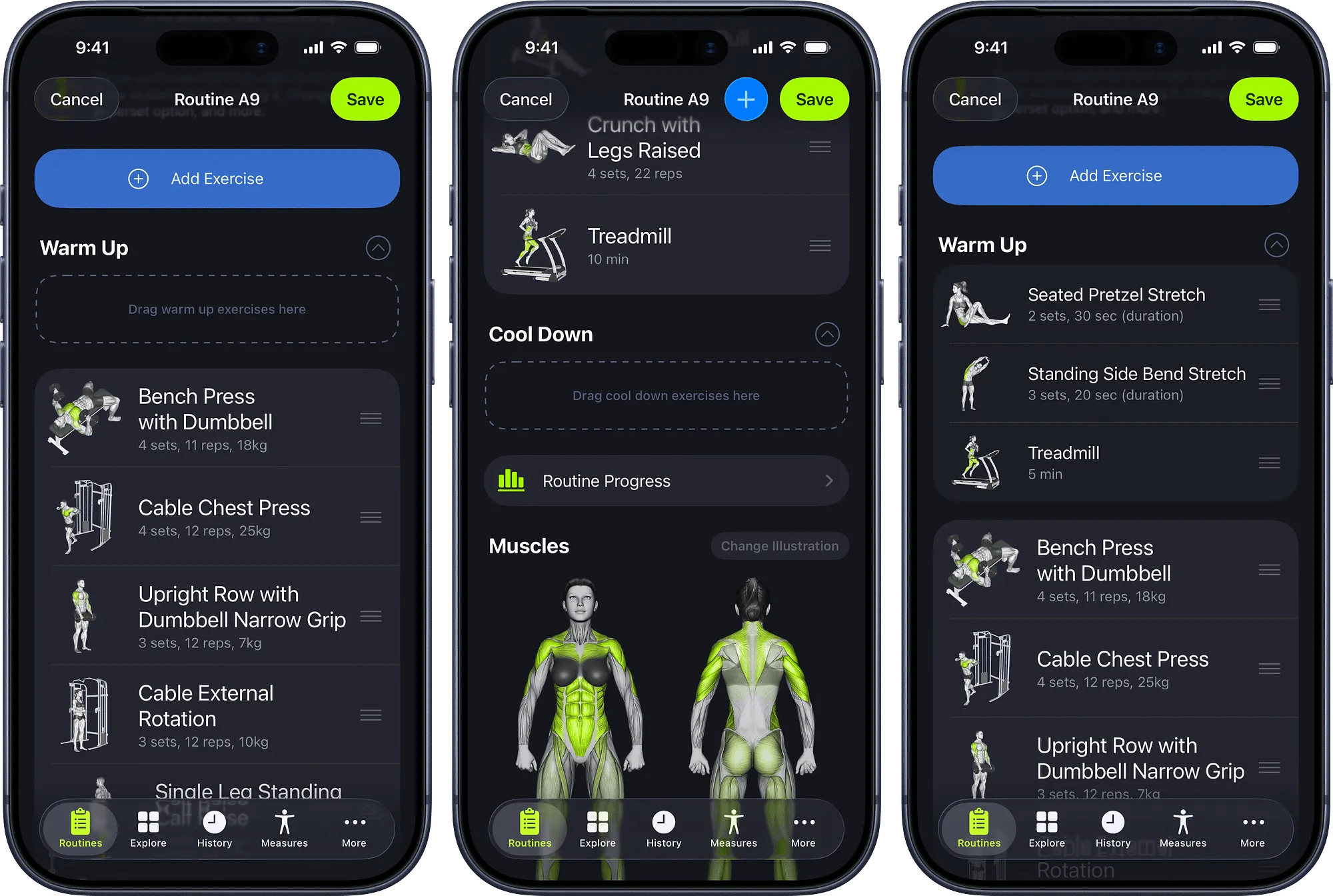 Os segmentos de rotinas possibilitam organizar uma sessão de treino em até três partes, permitindo adicionar exercícios ou alongamentos para o aquecimento, o treino principal e a recuperação.
