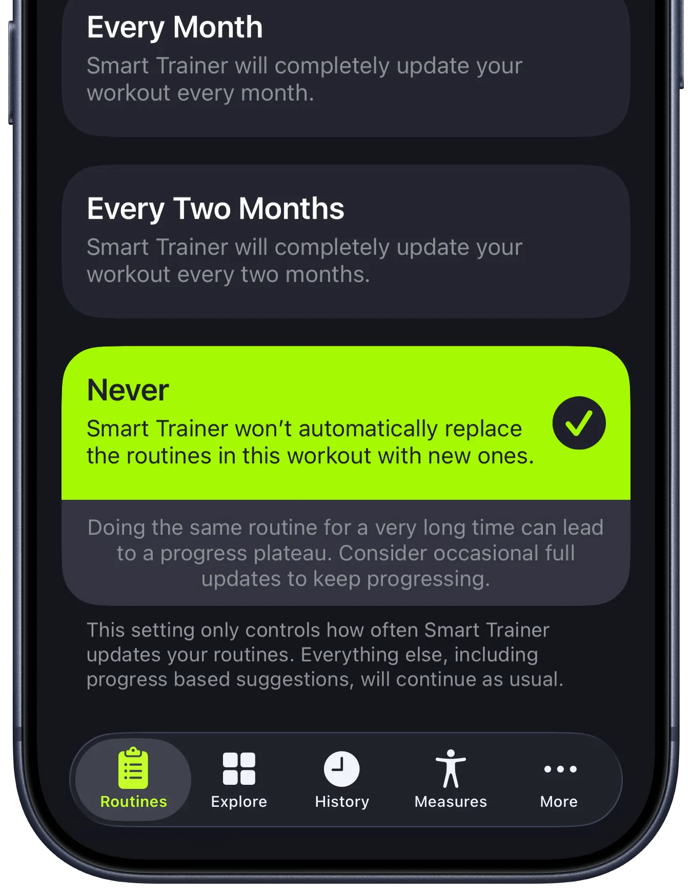 O Smart Trainer já permite que você configure a frequência com que ele sugere um plano de treino totalmente novo, com exercícios diferentes. Agora, ele também oferece uma opção para nunca substituir suas rotinas de treino automaticamente.