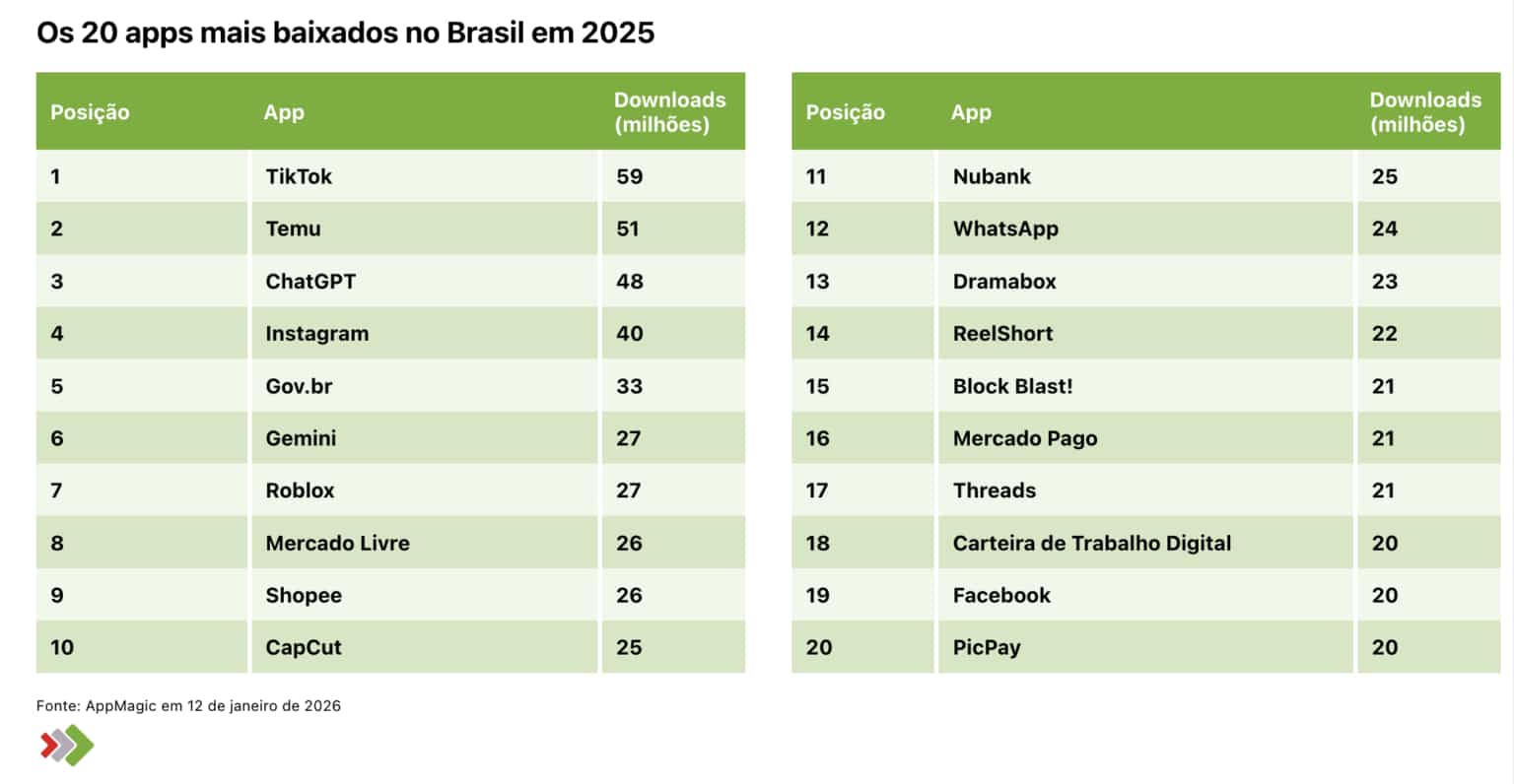Sim, 2026 já está entre nós, mas as retrospectivas relativas ao ano passado não param de pintar pela internet. Hoje, foi a vez do pessoal do Mobile Time compartilhar dados levantados pela AppMagic com os apps mais baixados no Brasil em 2025.