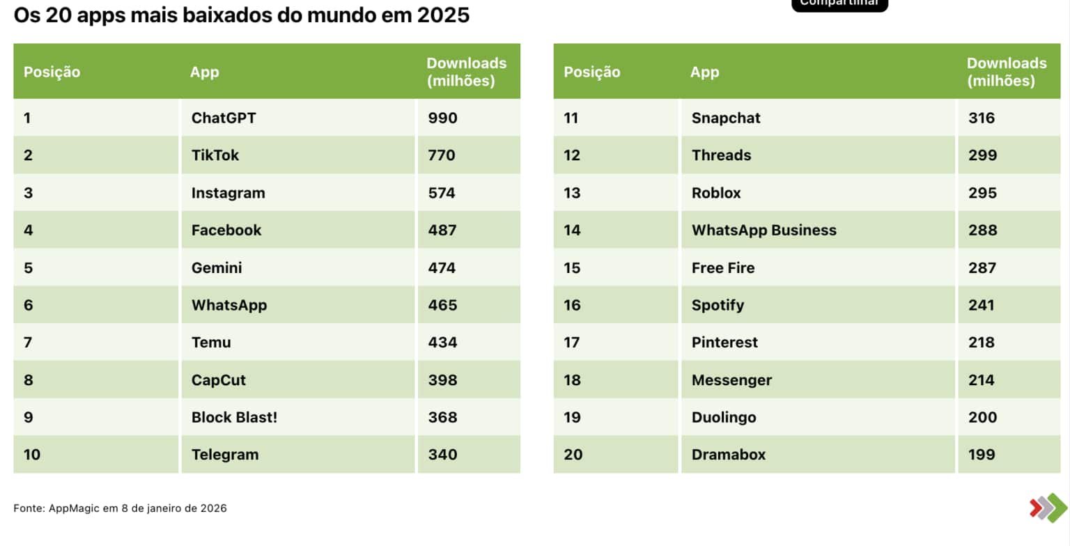 Neste cenário, quem lidera em termos de downloads é o ChatGPT (com nada menos que 990 milhões), seguido por TikTok (770 milhões), Instagram (574 milhões), Facebook (487 milhões) e Gemini (474 milhões) no Top 5.