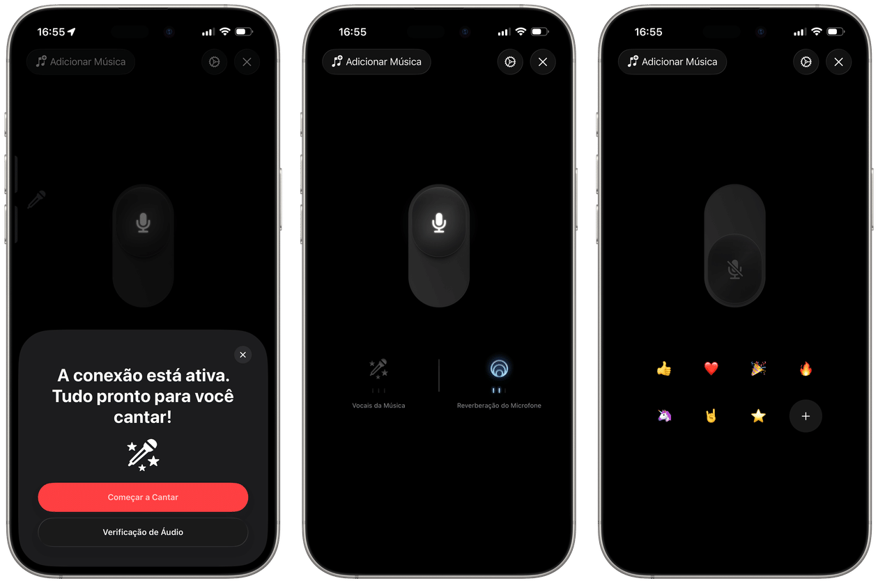 Na tela do iPhone, você pode controlar o volume, ativar/desativar o microfone, os vocais, a reverberação e até mesmo reagir à apresentação ao vivo de quem está cantando com emojis animados.