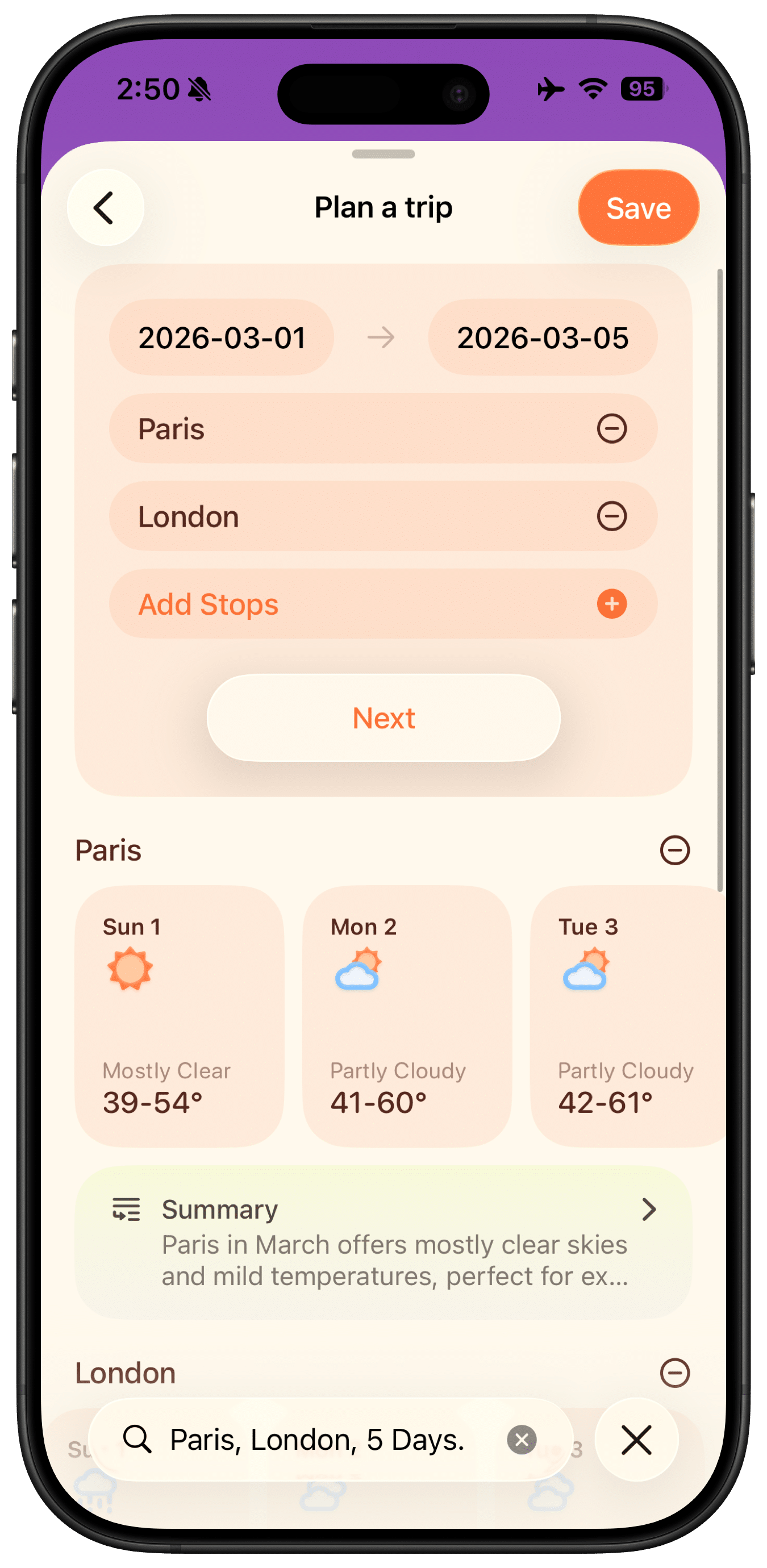Se você estiver prestes a viajar, basta informar as datas ao Weather mini e ele monitorará o clima do seu destino com antecedência. Mais do que isso, o app pode salvar essas informações, permitindo que você as consulte conforme a data da viagem se aproxima.