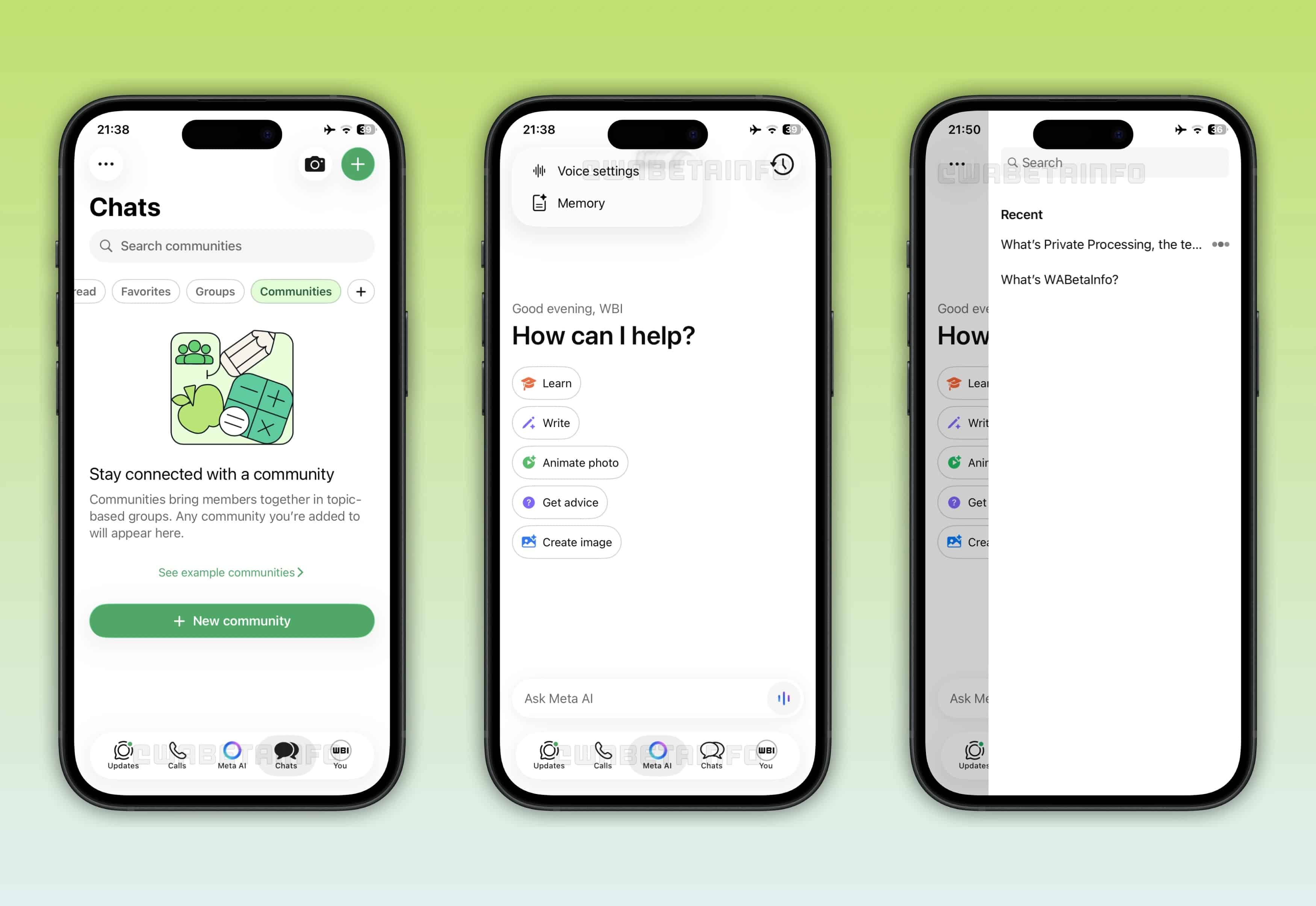 A Meta também continua preparando mudanças para a barra de abas. Após o lançamento da “nova” aba Você, o mensageiro está testando também uma aba para a Meta AI, que substituirá a atual dedicada às Comunidades.