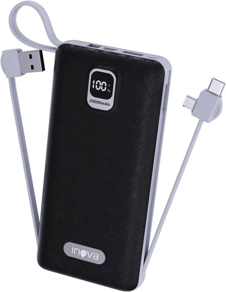 Conta com duas saídas USB-A (até 22.5W) e uma entrada/saída USB-C (até 20W), além de cabos integrados. O equipamento possui indicador LED de bateria, que informa o nível de carga disponível.