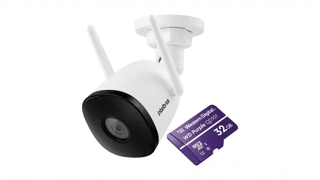 Essa câmera Full HD já vem com um cartão microSD de 32GB na caixa. O infravermelho alcança até 30 metros de distância no escuro total e a estrutura é feita para aguentar sol e chuva. Ela usa o Wi-Fi para transmitir as imagens e o áudio para o aplicativo.